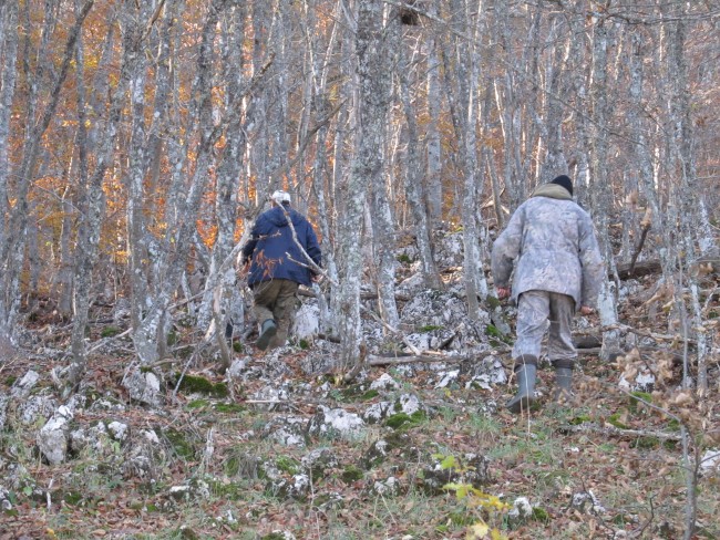 Получив список, из 12 участников, и пригласив с собой семерых, мы, пошли к склонам горы Кара-Тау наивысшая точка, которой - 1220 метров над уровнем моря. Со стороны гора ничем не примечательна, но углубившись в лес, полностью покрывающий ее склоны, ты просто поражен этой красотой и величием природы. Вековые буки и грабы обступают со всех сторон, каменные гребни и завалы из деревьев, карстовые воронки и глубокие овраги, берущие свое начало от вершины горы и тянущиеся до ее подножия. Но, как известно – «ничего даром не дается», у этой красоты была и другая сторона, труднопроходимость. Да, места там просто уникальные, но и вальдшнеп птица специфическая, интересная не только в плане охоты, но и соревнований. Собакам было очень тяжело работать, досталось и нам. Было всякое, и опасные падения в спешке, и бег с «препятствиями» в стиле а-ля «горный козел», где перепрыгивая через поваленные деревья и высокие камни, мчишься по склону вниз, и судорожное карабканье на четвереньках вверх по склону к стоящей собаке, ведь вальдшнеп не фазан и каждая встреча с ним ценна. В общем, мы делали всё, что могли чтобы быть как можно ближе к месту стойки и максимально видеть все элементы. Так и работали, без обеда и остановки, до темна.