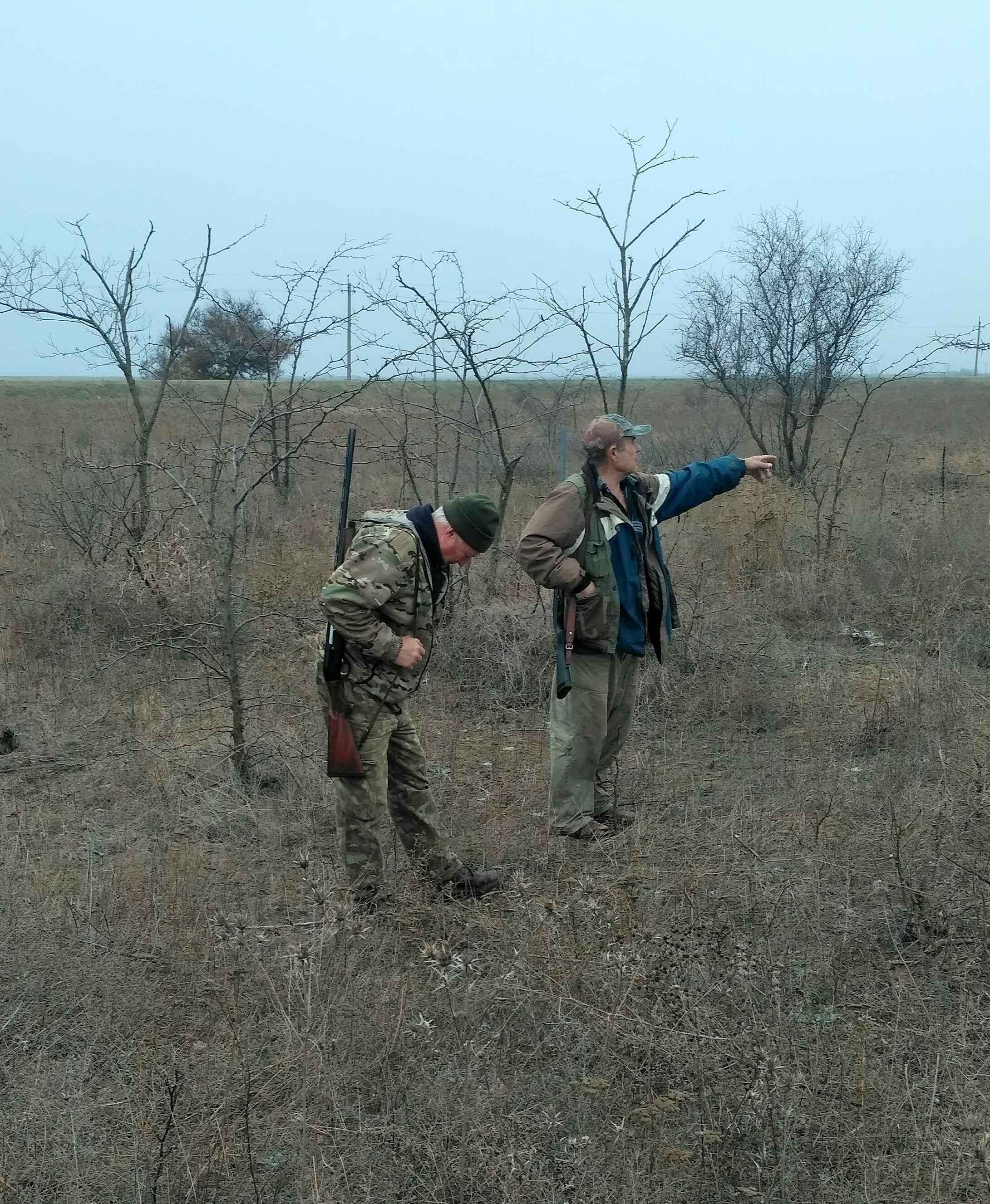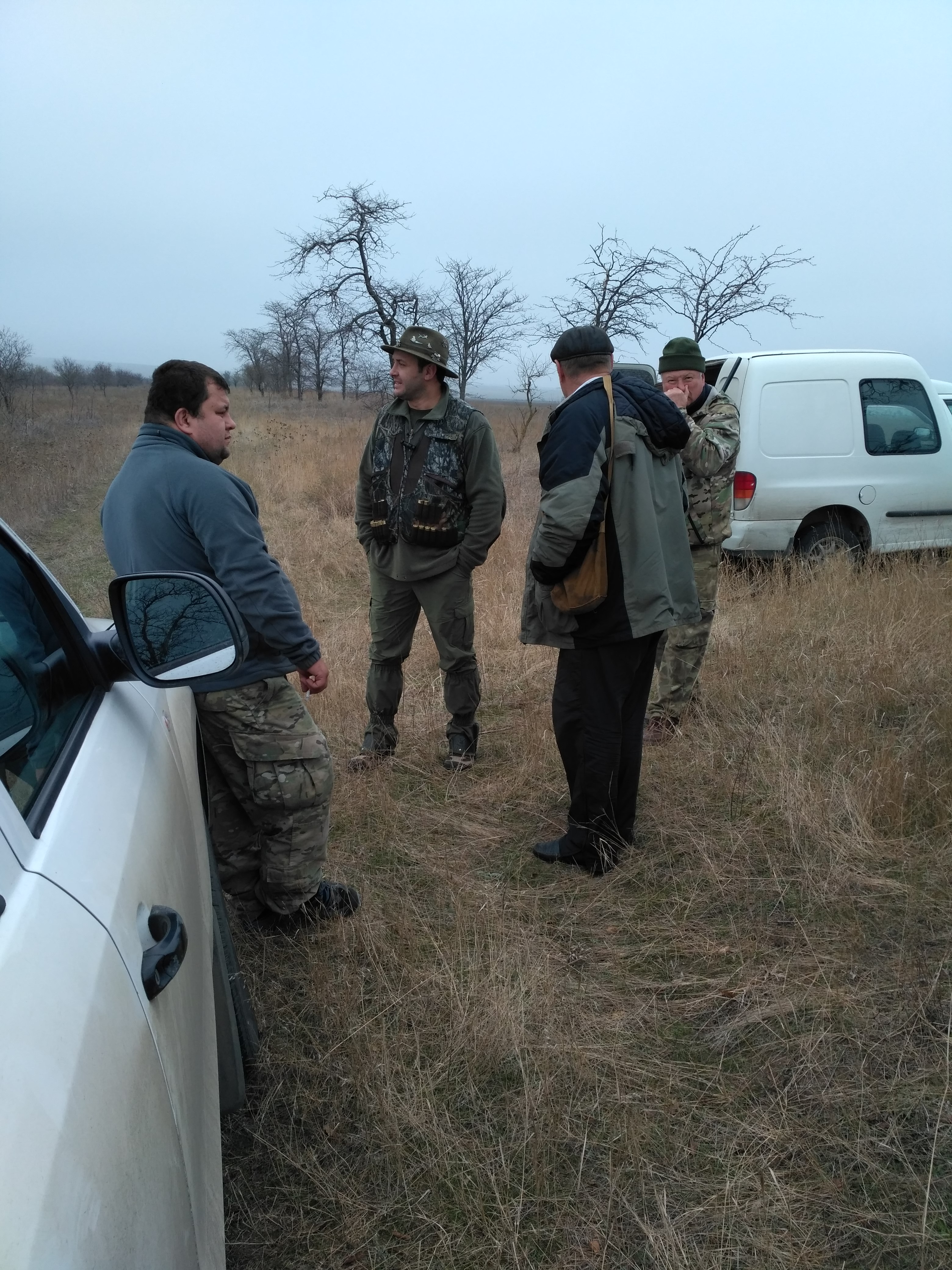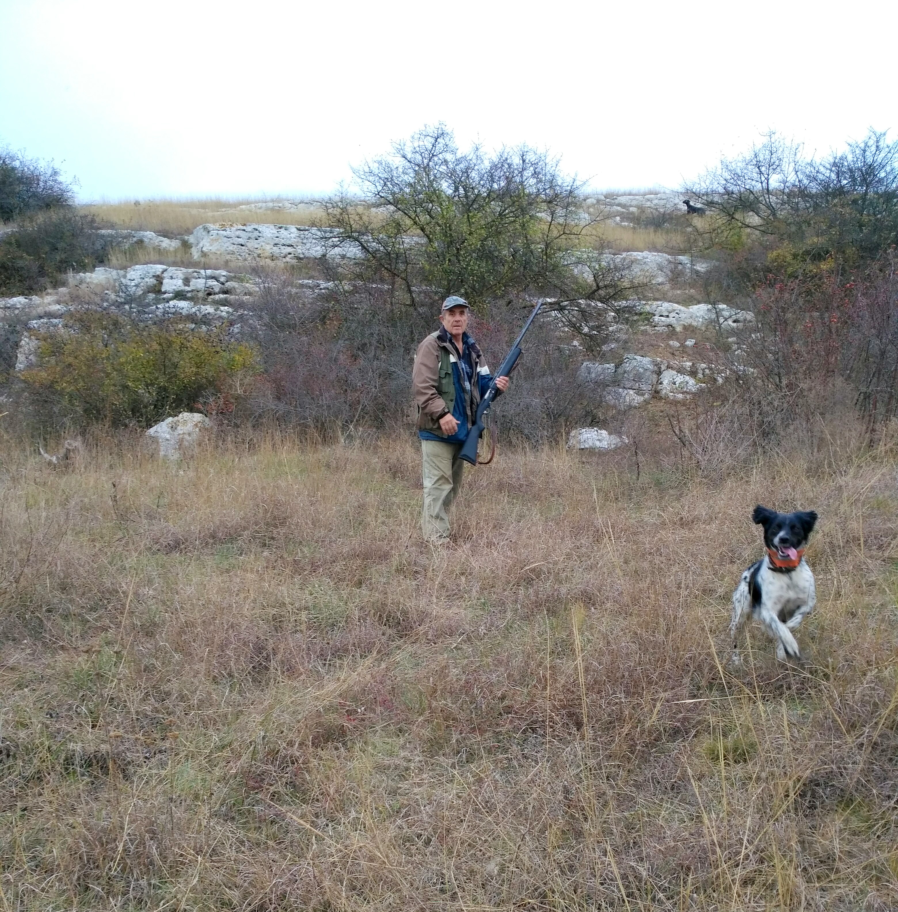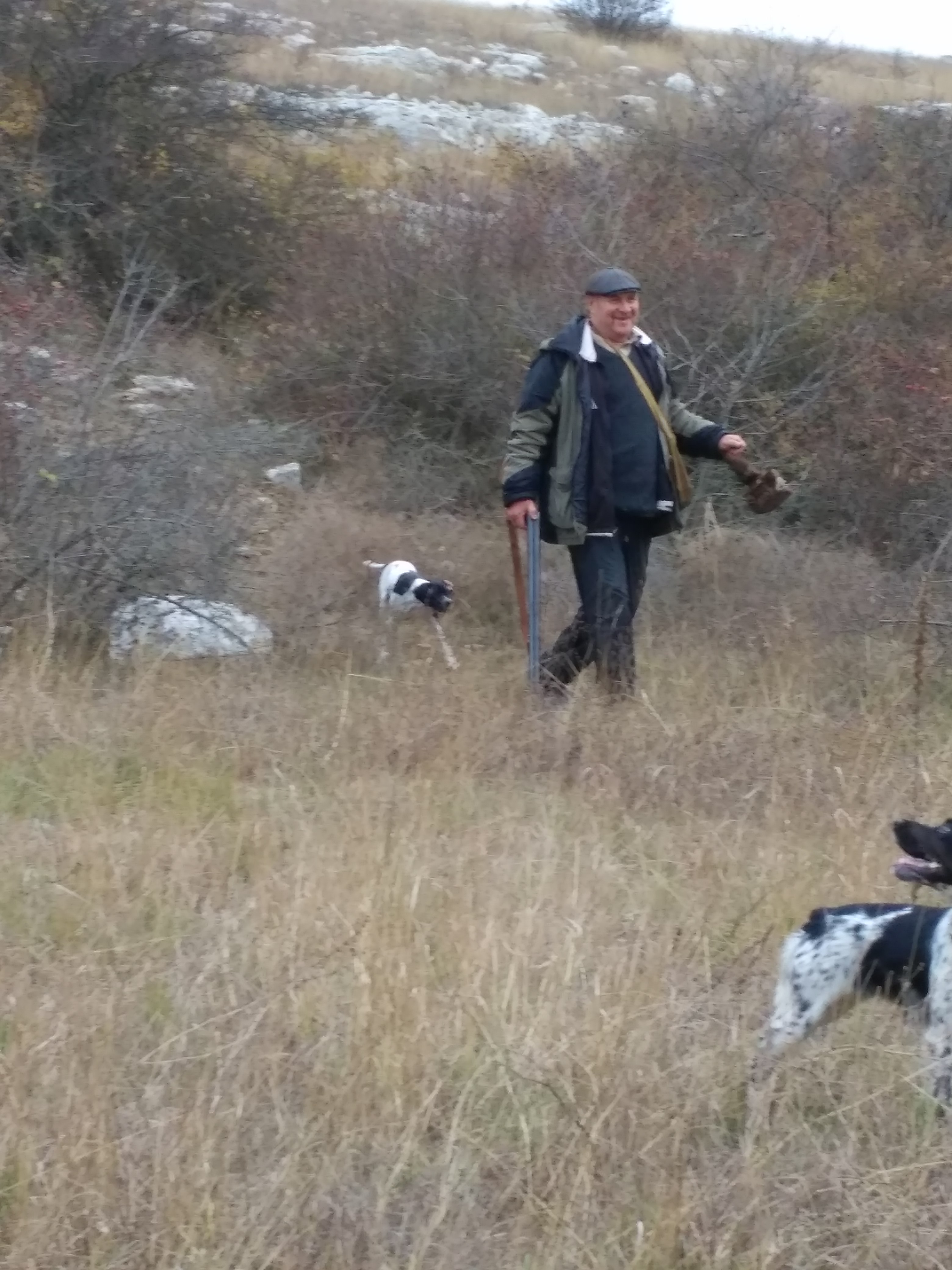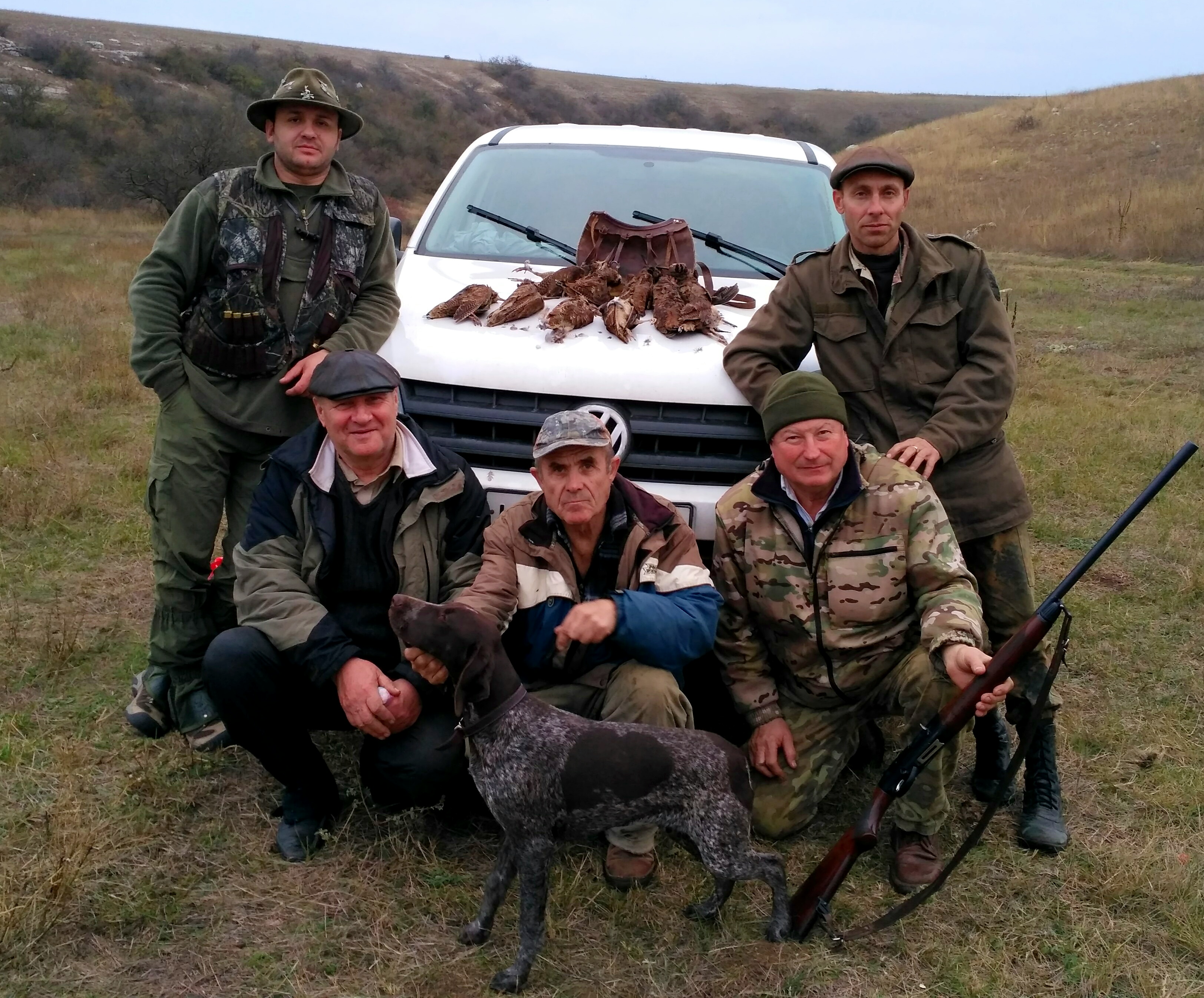В пятницу позвонил Леонид Иванович и сказал вальдшнеп сыпанул. Едете? Конечно едем. В авральном порядке проплачиваем разрешения и в 6 утра субботы стартуем. Охотиться предстояло в шестеро. Поэтому по приезду на место расходимся каждый в своём направлении. У ребят переодивается гремят выстрелы, а у нас пока тишина. Или нам не повезло с местом, или делаем что-то не правильно. Но собаки даже не переходят на потяжки. Отработали два табунка куропаток, а вальдшнепа почему нет. Сходимся. У ребят 3 добытых вальдшнепа. Обсудили ситуацию. Переезжаем на новое место. Место не позволяет ходить 3 группами. Ходим 2. В заброшенном винограднике попадаются 2 перепела, несколько табунков куропаток. Вальдшнепа не много но все-таки есть. Видимо этой ночью большая часть его уже отлетела. Обедает. И снова на поиски. Переодически попадаются охотники. Корректируем сними свой маршрут,чтобы не тратить время на хоженные места. Много грибников. Четверка дроф поднимает настроение. Помогали им кепкой. И дальше на поиски. День пролетает незаметно. И в зачёт жизни вероятно не пойдет.