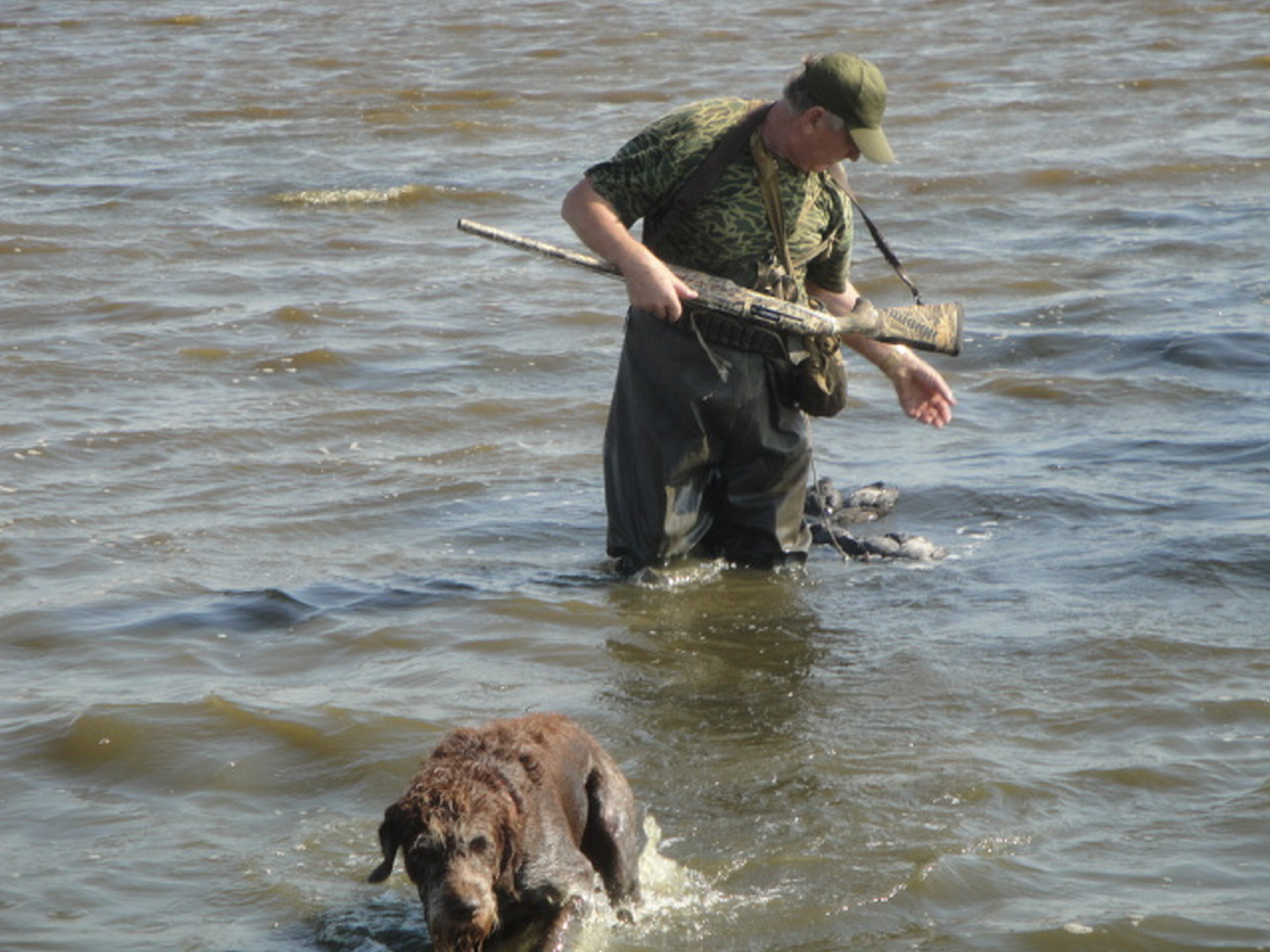 Рано утром приехали и мы. Утрянку отстояли на ура. Вышли из воды разбили лагерь и приготовили праздничную шурпу. Отметили это дело. съездили на море искупались и снова в болото на вечерку. Ужин и большинство уехало домой. Сегодня в воскресенье утки практически не было, вчера всю разогнали. Я сделал один выстрел и сбил одну утку. С воды же вынес шесть штук. Граф лазил по камышам и таскал мне вчерашних подранков. Людей то вчера было уйма. Машины облепили со всех сторон, стреляли много.