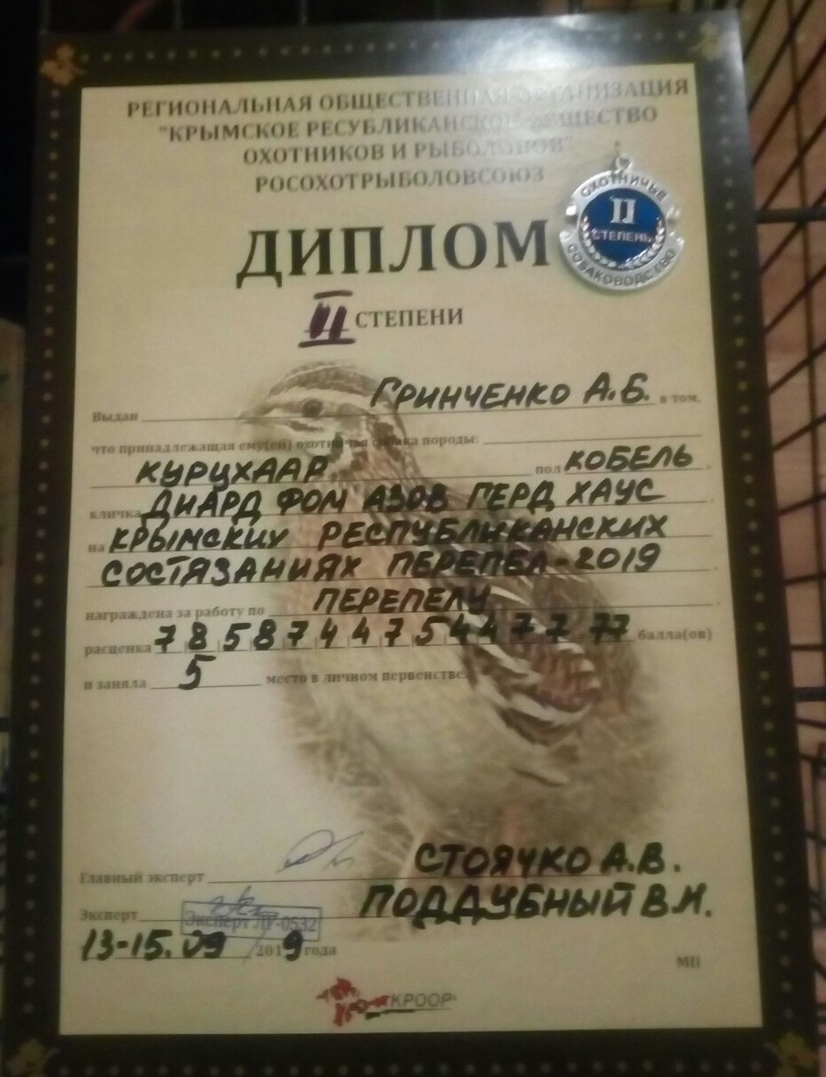 13-15 сентября 2019 года. Крымские Республиканские состязания "Перепел 2019". 49 собак. Поучаствовали. Диард фом Азов Герд Хауз - Диплом 2 степени по перепелу - 77 баллов. 5 место в личном первенстве!! Спасибо руководству КРООРа за отличную организацию состязаний. Состязания были проведены на высоком уровне! Птицы было очень много. Все собаки имели по 2-4 встречи. Отличный призовой фонд. Теплая дружеская атмосфера. На сегодняшний день свободна шикарная сука черно-крапчатого окраса - Иджи фром Грин Вэлли, будет с отличным экстерьером, хорошим характером. Умеет ходить на поводке, знает кличку, команду ко мне. 3,5 месяцев, все прививки, глистогонка, обработка от блох и клещей. Документы РКФ. Кобель - Ирбис фром Грин Вэлли нашел своего охотника.