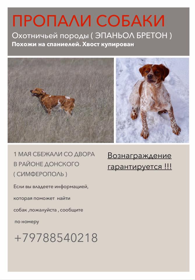 01.05.17 со двора сбежали две суки эпаньол бретона (одна беременная), есть чипы. Важна любая информация о собаках