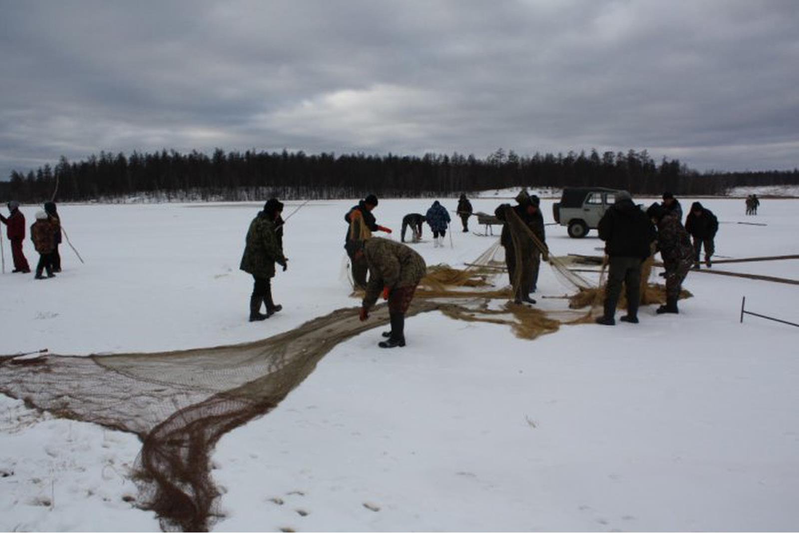 Как только озера покроются достаточно крепким льдом, способным выдержать большое количество людей, наступает пора мунгха. И стар и млад с удовольствием принимают участие в этом увлекательном виде рыбалки. И мы - программа "Охота и рыбалка в Якутии" (http://ohotayakutia.ru/) не остались в стороне - наша съемочная группа едет в Сатагай Амгинского района, куда нас пригласили принять участие в большой зимней рыбалке неводом.Особым и любимым видом национальной рыбалки народа саха считается мунгха (подледное неводование). Кстати, такой метод коллективной рыбалки в мире считается уникальным. Зрелище азартное и неповторимое, по большому счету это разновидность облавной охоты, только на карася и подо льдом. Поэтому и решил я разместить здесь.Как только озеро покроется достаточно крепким льдом, способным выдержать большое количество людей, наступает пора мунгха. Жители деревни заранее собираются у главного распорядителя и совещаются, какое озеро в этом году будут неводить. Надо сказать, что существует обычай – после неводования озеро не трогают в течении 3-4 лет, с тем, чтобы восстановилась рыба. Также запрещается применять невод с мелкой ячеей. Рано утром участники мунгха идут к выбранному озеру. На большой невод на заранее выбранное озеро выходят практически все мужчины деревни, которые делятся на команды – одни прорубают лунки, другие проводят и тянут невод, третьи гонят рыбу, последние вычерпывают рыбу сачками.