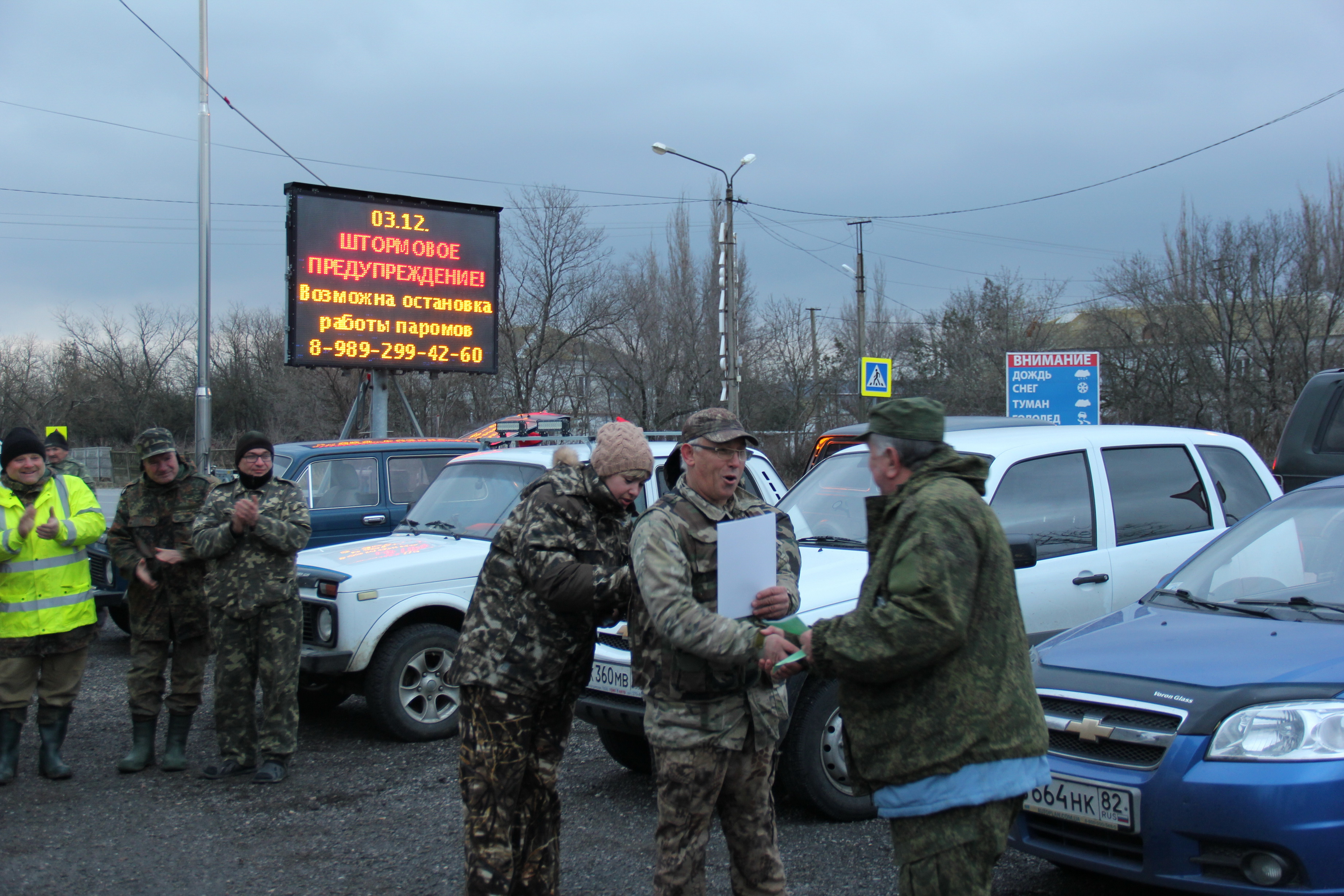 6 40..пост ГАИ..Огромное информационное табло Керченской переправы-ШТОРМОВОЕ ПРЕДУПРЕЖДЕНИЕ,Переправа ЗАКРЫТА..И правда, мокрый снег, с сильным ветром,нихрена не душно.