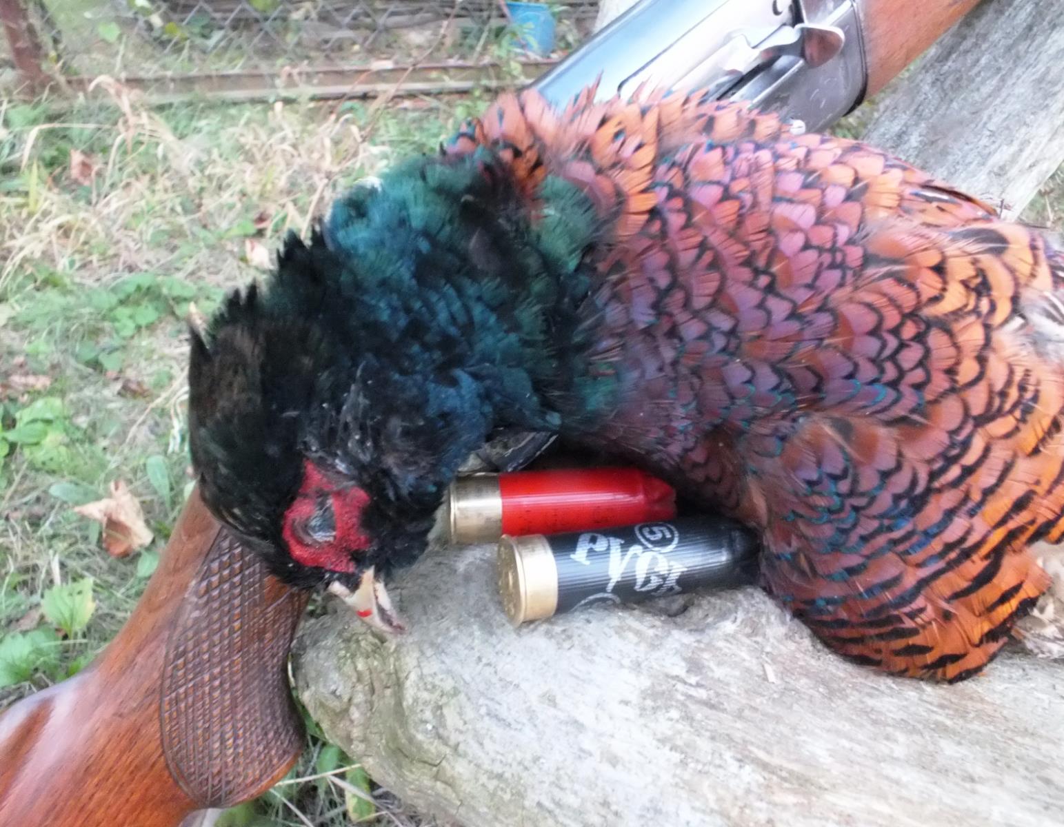 Второго петуха я взял, очень долго наблюдая как фазан водил собаку в кураях. Минут 10 петух бегал от собаки в радиусе ста метров. Но все таки Граф сделал его, а я довершил начатое.
