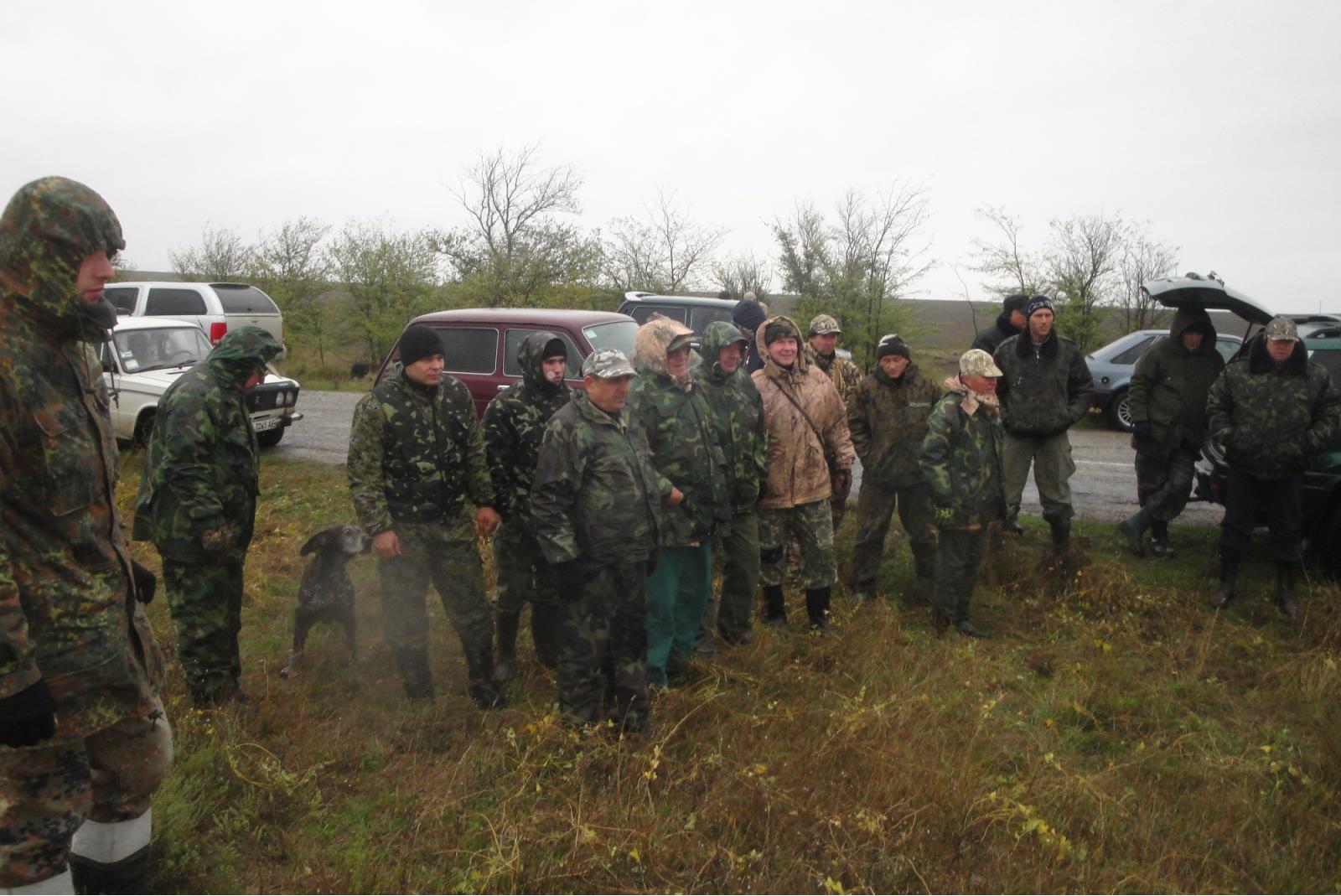 И так открытие на фазана и куропатку. Меня на форуме спрашивали куда я поеду? Скажу долго колебался. Против поездки на фазана было достаточно аргументов. Во-первых считаю, что охота с подружейной собакой должна быть индивидуальной. Во-вторых погодные условия, по прогнозу, были явно не для фазана. Дождь и северный ветер 10м/с, это не для фазана, и собаке тяжело работать в таких условиях. Хотел поехать пострелять утку, для нее как раз отличная погода. Но прочитав амбициозные высказывания Саши Цветкова, что его собака работает в любых условиях и поддавшись на уговоры моего товарища по охоте на перепела, решил присоединиться к его компании врачей и поехать на фазана. Все таки открытие, это праздник. И так в 7-00 я со своей домашней командой в составе водителя-сына, Отца-наставника, меня и конечно дратхаара-Графа на на месте. Отец в свои 91 год ружьё в руках держать не может толь палочку для опирания, но требует что бы я возил его на охоту. Стали подъезжать машины. Вложение: Машин становилось все больше и больше и все как-то были битком наполнены охотниками. Вложение: В итоге собралось довольно обширное общество. попытался сделать одно фото но это не возможно. Вложение: Вложение: Провели построение , инструктаж и поздравления. Вложение: Вложение: Наш председатель Керченской ГО КРООР Пузиков Владимир Владимирович. Вложение: Нас разделили на команды за каждой закрепили егеря. Моя команда ( меня избрали старшим), состояла из 8 человек врачей и еще 7 человек из правохранительных органов. С которыми мы разделились еще на две команды. Нам выделили участок вдоль Марьевского леса, который принадлежал когда то нашей охотничьей органиции и в посадке которого, после войны, участвовал еще мой отец. Лес отобрали вместе выращенными там нашими охотниками фазанами. Расчет был на то что фазан выйдет из леса на кормешку в поля. Пошли по полю. Как я уже говорил нас осталось 8 человек и две собаки , мой дратхаар и еще один курцхаар. Прочесав довольно изрядно поле, получив от Графа одну стойку, из под которой я сбил перепела, поняли что в такую погоду фазан не выйдет из леса. Гусой лес лучше чем мокрый бурьян. Решили идти подальше от леса там где лесополосы. Пройдя метров 300 вдоль жиденькой лесополоски Граф на сойке, подъем вылетает курица, отпускаю её не стреляя. Еще метров 100, стойка, выстрел и первый петух повис у меня на тороке. В конце лесополосы ожидавший нас егерь сказал, что три фазана вылетели в поле. Я предложил всем растянуться в цепь, а сам зайду в конец поля и с Графом пойду в ветер на них. Так и сделали. Но фазан не хотел летать в чистом поле и все время убегал в мокрой траве. Как ни старался Граф, стойка за стойкой, а фазан все убегал и убегал. Но одного мы с Графом всетаки заставили взлететь. Так на тороке у меня повис вторй. Увлекшись поиском фазана в поле, я потерял из виду своих колег. И вдруг услышал за изломом поля в не поля видимости дуплет. Это зоаут меня решил я двинулся к ним. Потом вдруг началась канонада, выстрелов было наверо штук 20-30. - -Нетерпеливые, подумал я. Пройдя поле я вышел к своей команде, которая разбрелась в начале двух сошедшихся лесополос. Только подошли к ним Граф тут же делает стойку. Выстрел, у меня третий фазан, все норма. "-Блин мы же там, втроем топтались", кричали мужики. Вот так. Оказывается из этих двух лесополос вылетела куча фазана, вот откуда 