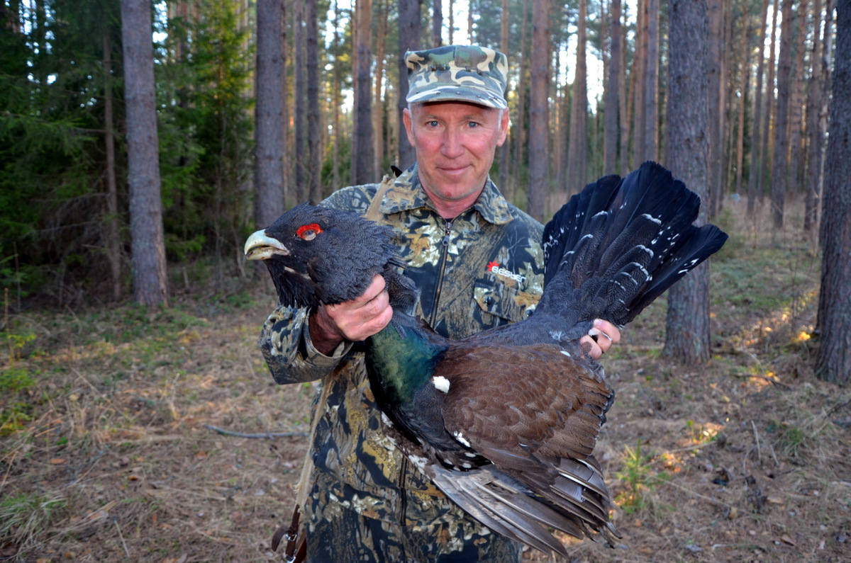 Вечером на подслухе глухарей услышали наконец-то «теканье», правда без второго калена песни. Будем считать, что мне повезло: без песни удалось увидеть на высоко сосне птицу, подкрасться по влажному мху и удачно выстрелить….