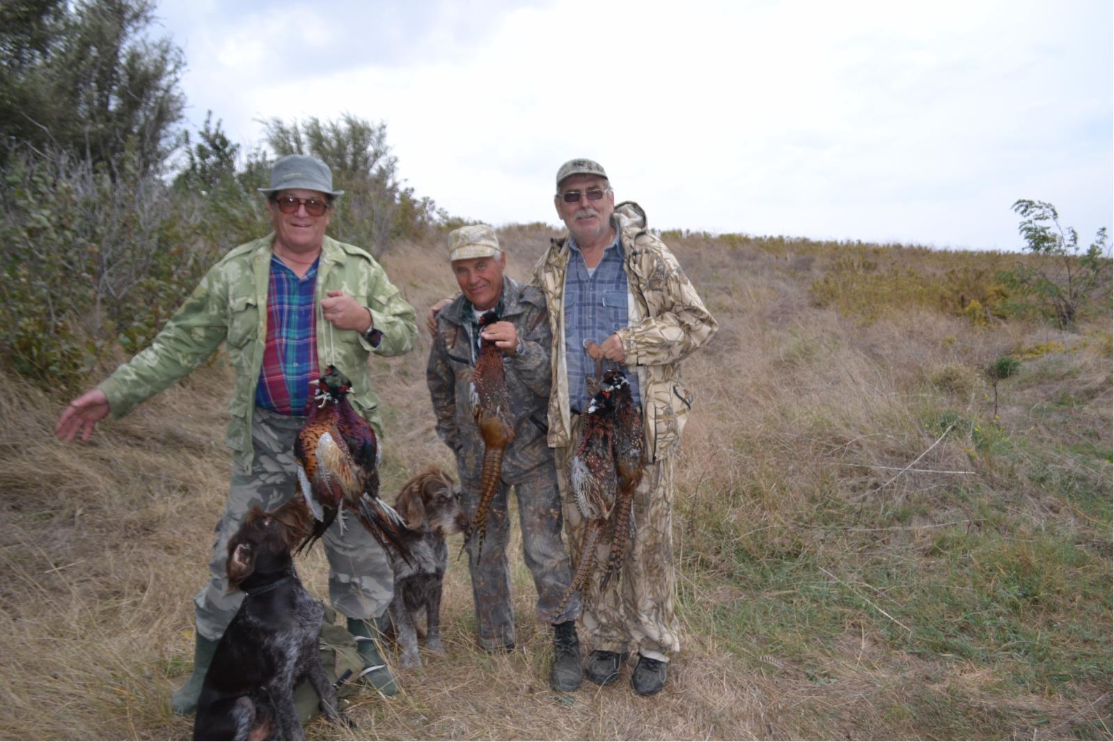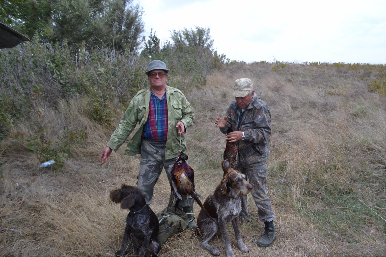 Поднялись на верх, так как нас со всех сторон окружили охотники. Решили переехать в другое место. Позвонили водителю он подъехал и говорит, что когда мы спускались много фазана вышло за нами. Передумали и решили еще раз прочесать это место. Тут подъехал наш егерь, поговорили и пошли снова. Прошел несколько метров, стойка собаки в непролазных зарослях.