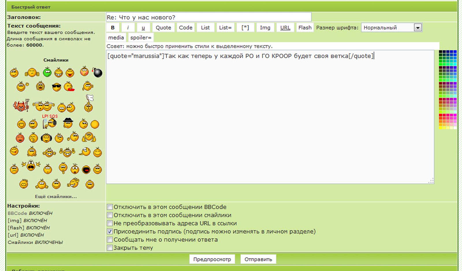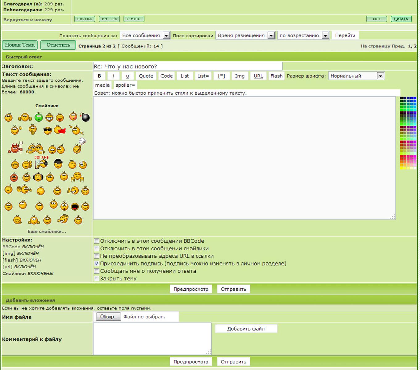 Теперь в быстром ответе есть смайлики, можно использовать ббкод и загружать файлы!