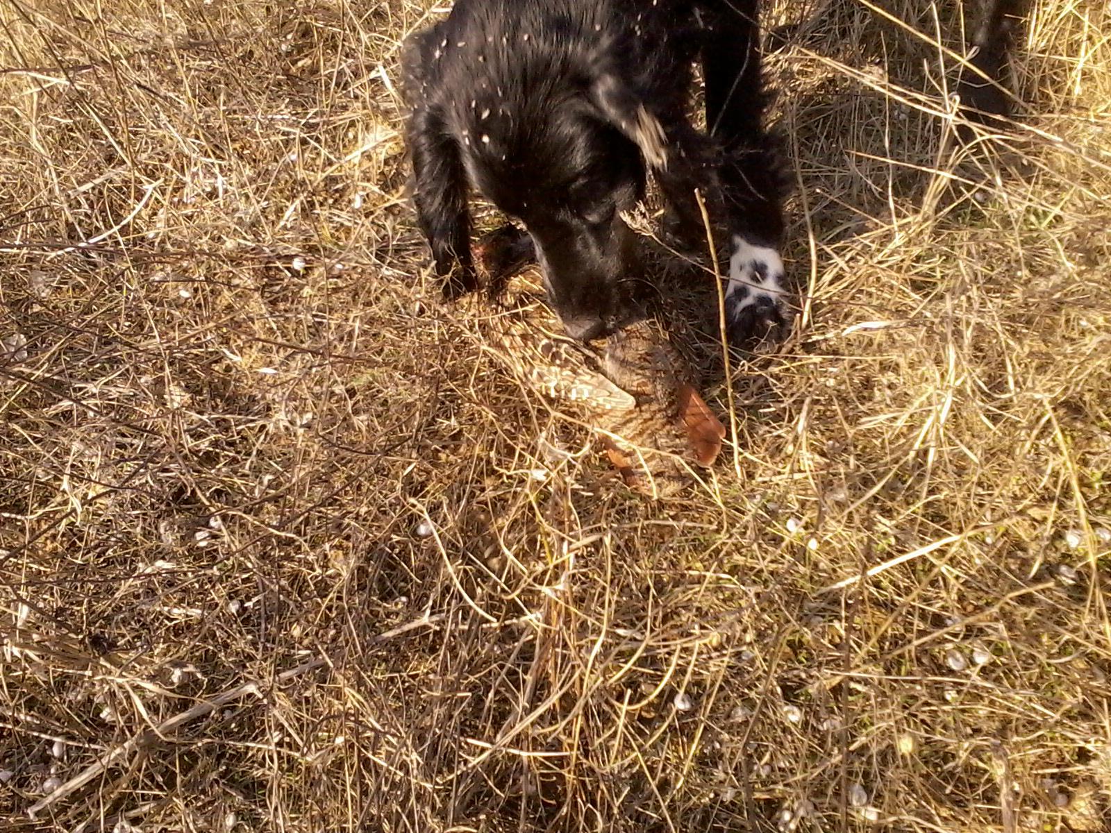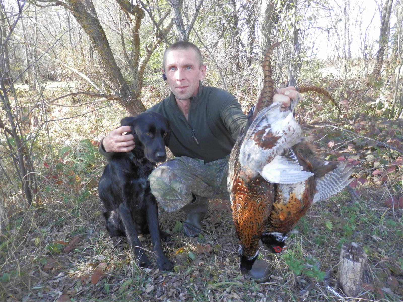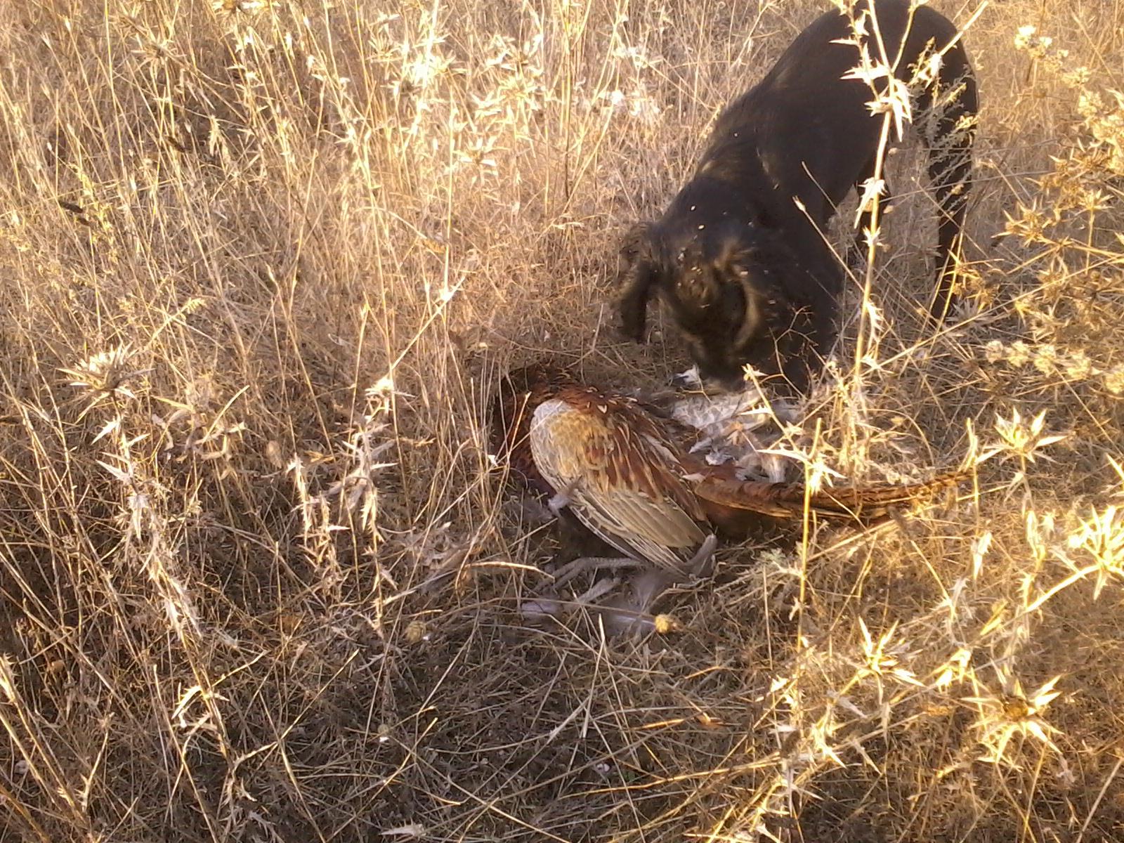 Собака крутится возле фазана,первый в нашей с ней охоте!