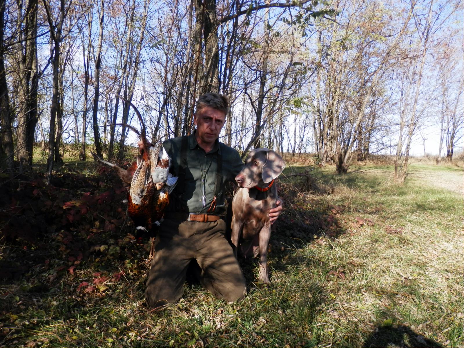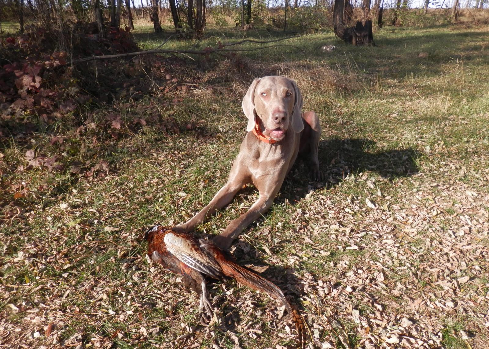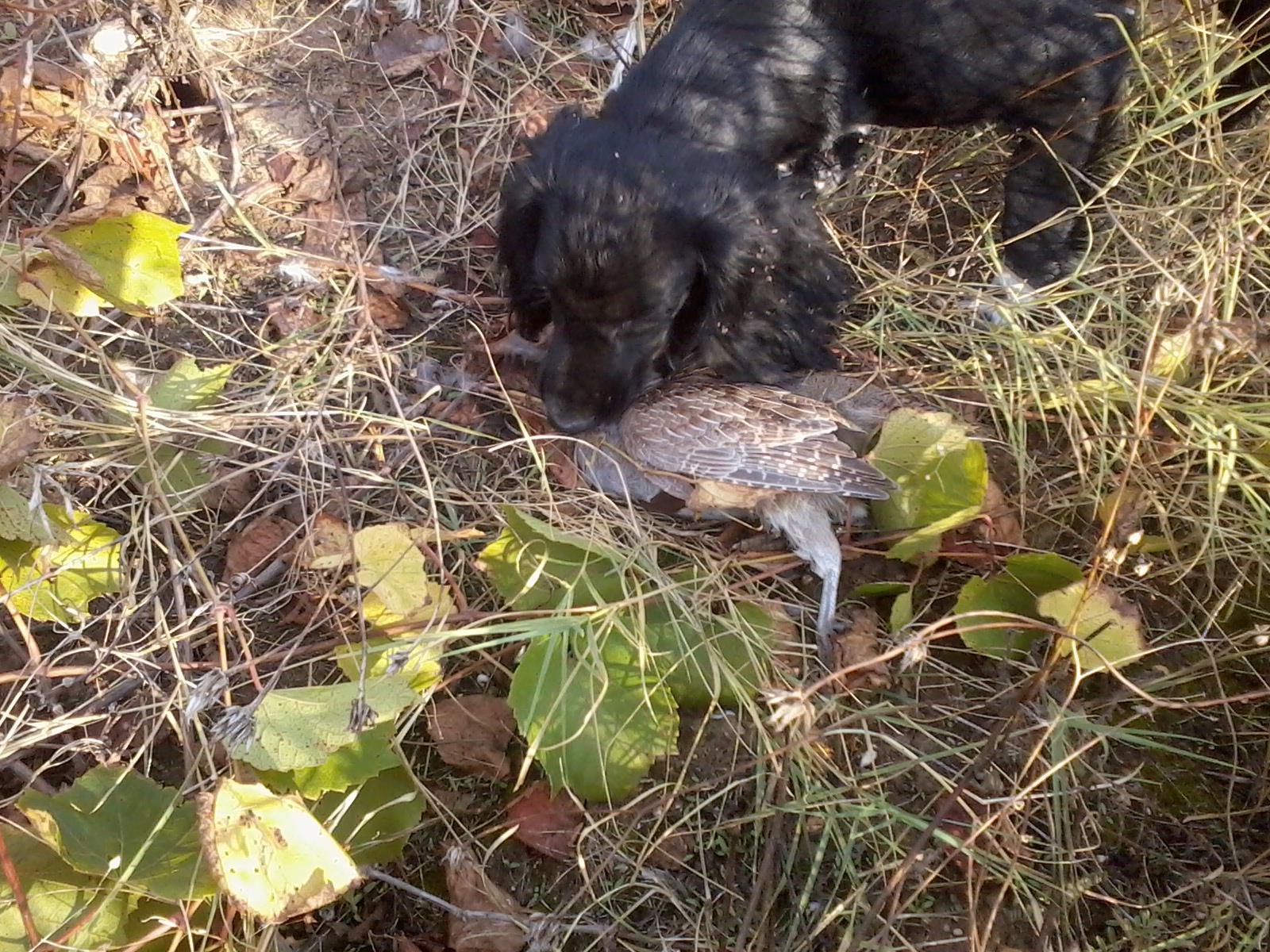 Собака крутится возле фазана,первый в нашей с ней охоте!