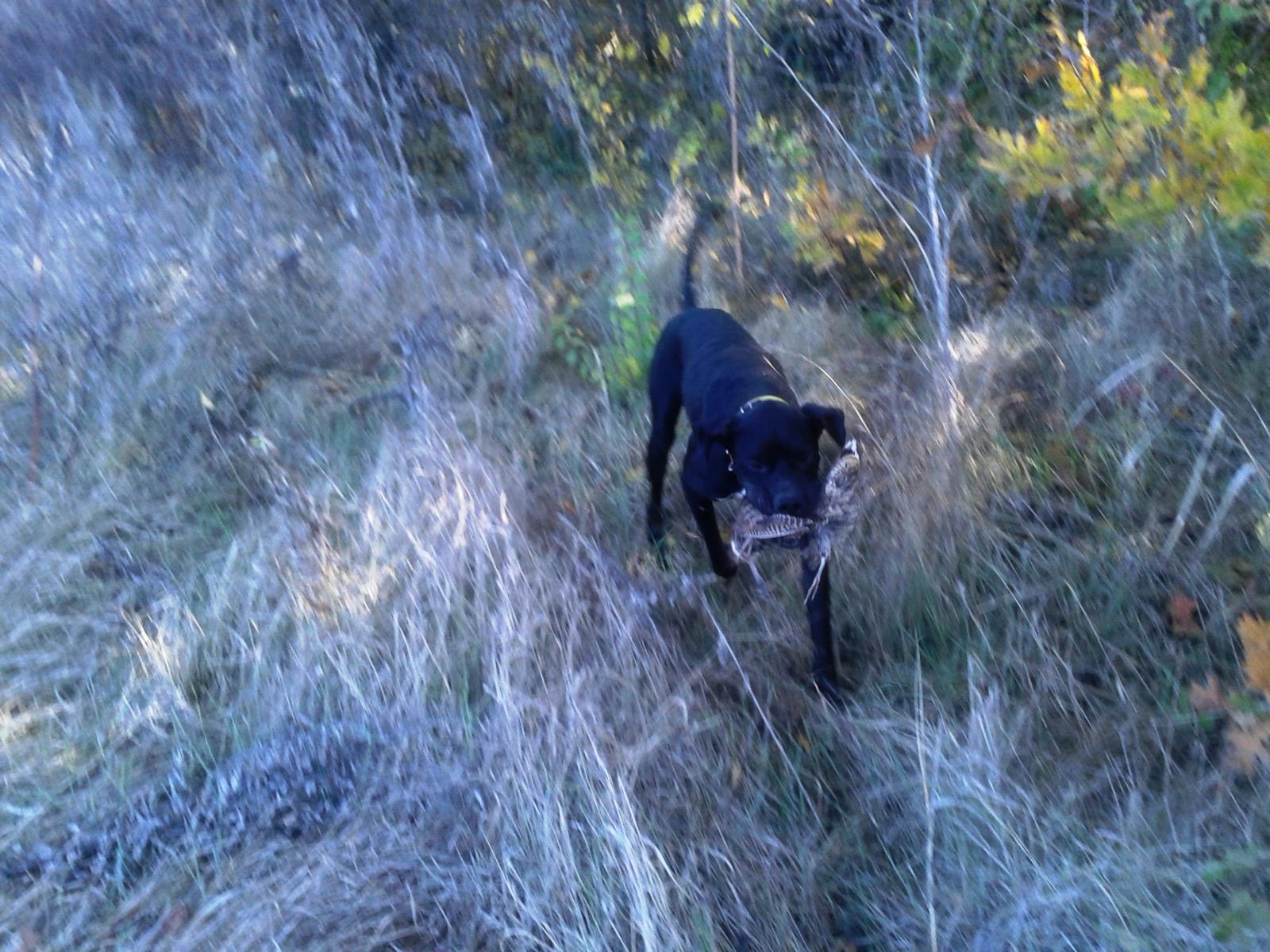 Нам ничего не оставалось, кроме охоты на ближайшем поле, где очень скоро Айна нашла 3 выводка куропатки и подняла зайца, который после выстрела "в угон" пытался уйти от нее на трех конечностях, но далеко, конечно, не ушел....