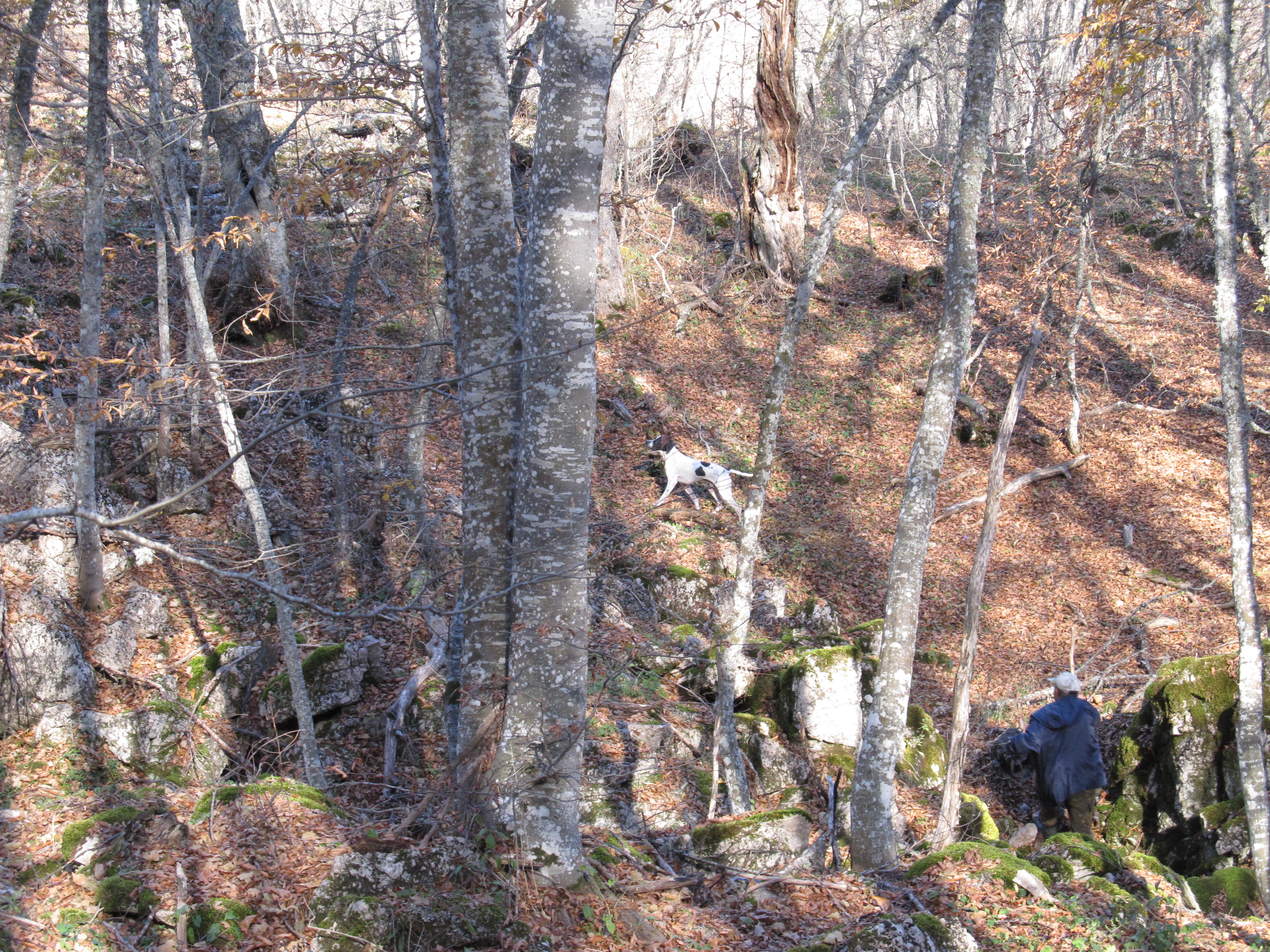 Получив список, из 12 участников, и пригласив с собой семерых, мы, пошли к склонам горы Кара-Тау наивысшая точка, которой - 1220 метров над уровнем моря. Со стороны гора ничем не примечательна, но углубившись в лес, полностью покрывающий ее склоны, ты просто поражен этой красотой и величием природы. Вековые буки и грабы обступают со всех сторон, каменные гребни и завалы из деревьев, карстовые воронки и глубокие овраги, берущие свое начало от вершины горы и тянущиеся до ее подножия. Но, как известно – «ничего даром не дается», у этой красоты была и другая сторона, труднопроходимость. Да, места там просто уникальные, но и вальдшнеп птица специфическая, интересная не только в плане охоты, но и соревнований. Собакам было очень тяжело работать, досталось и нам. Было всякое, и опасные падения в спешке, и бег с «препятствиями» в стиле а-ля «горный козел», где перепрыгивая через поваленные деревья и высокие камни, мчишься по склону вниз, и судорожное карабканье на четвереньках вверх по склону к стоящей собаке, ведь вальдшнеп не фазан и каждая встреча с ним ценна. В общем, мы делали всё, что могли чтобы быть как можно ближе к месту стойки и максимально видеть все элементы. Так и работали, без обеда и остановки, до темна.