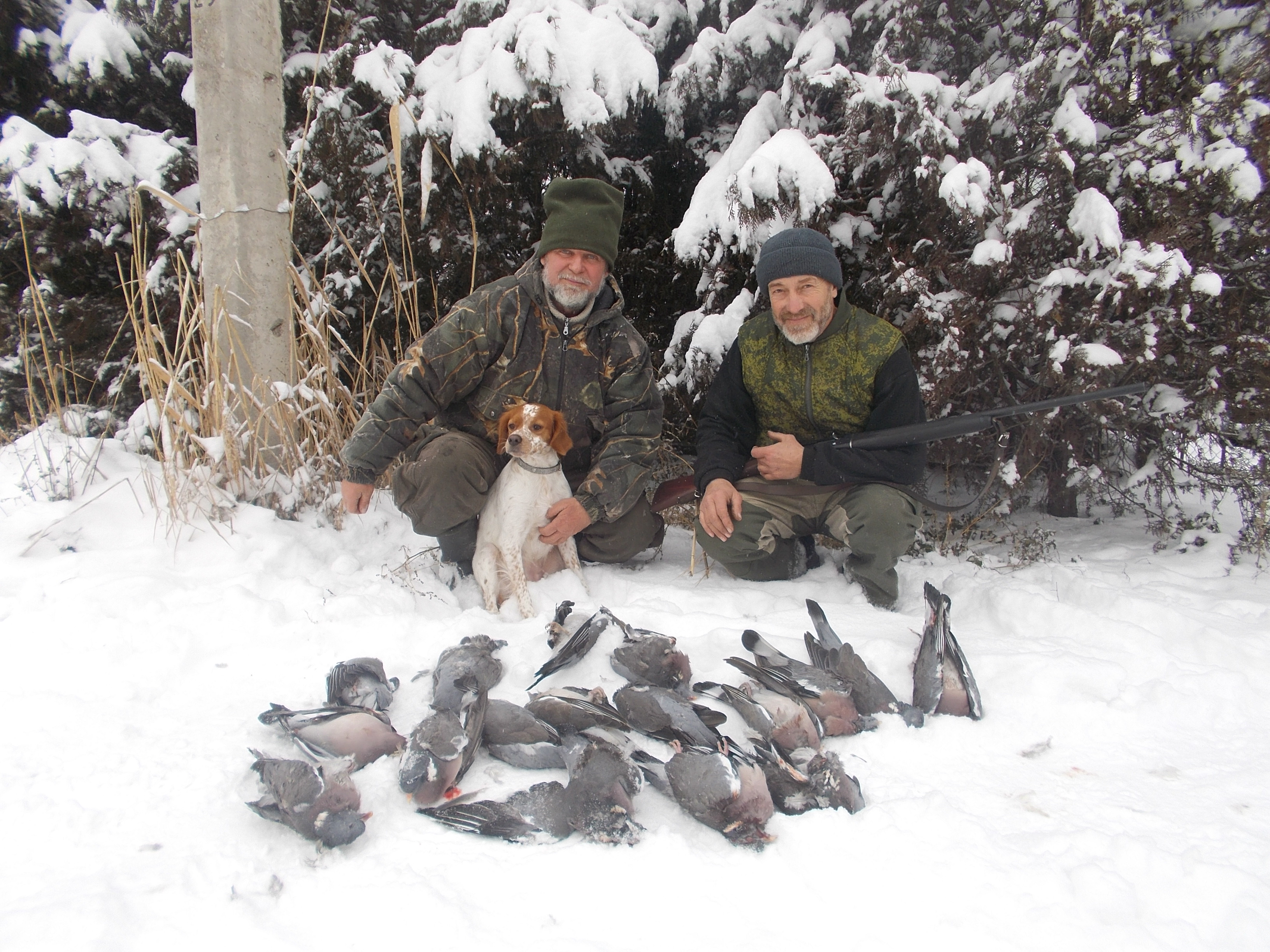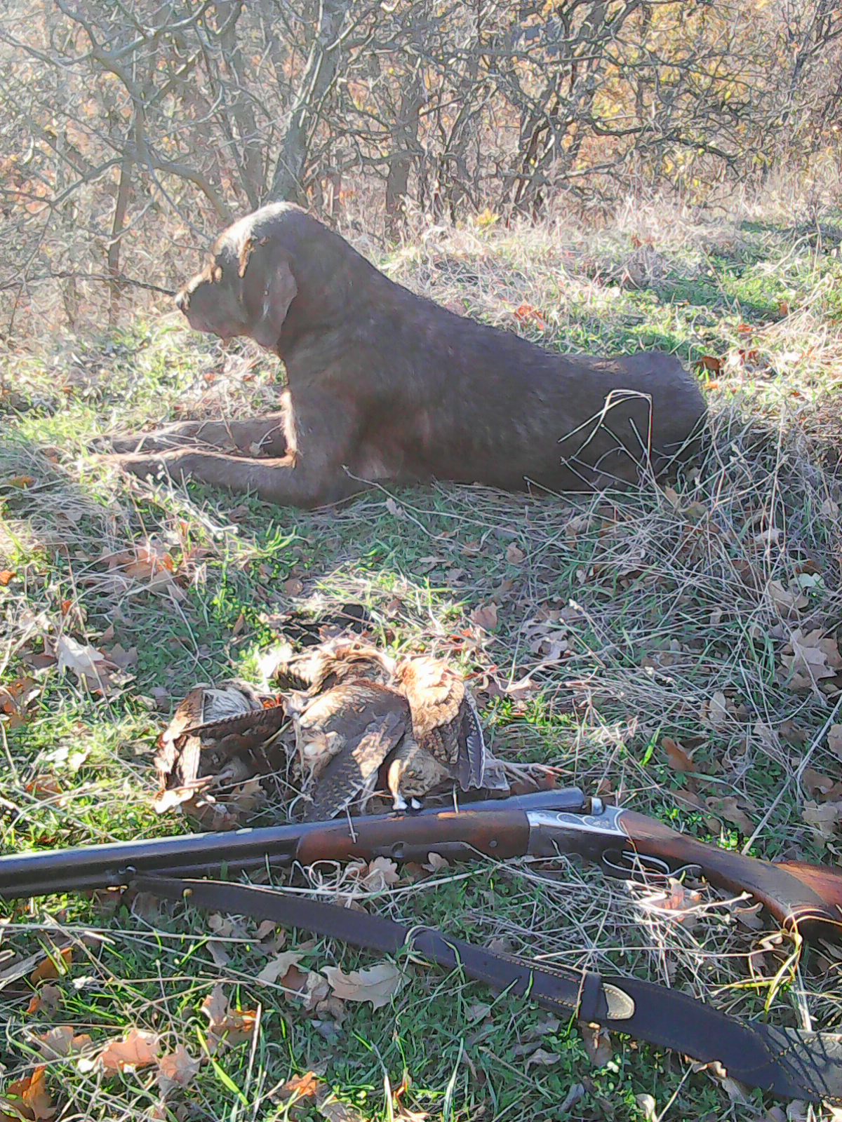 Вальдшнепа поменьше,но есть, поднимается далеко, настеганый да и сухо трещит под ногами и лапами, больше десятка ушло без выстрела,троих взяли,троих промазал.