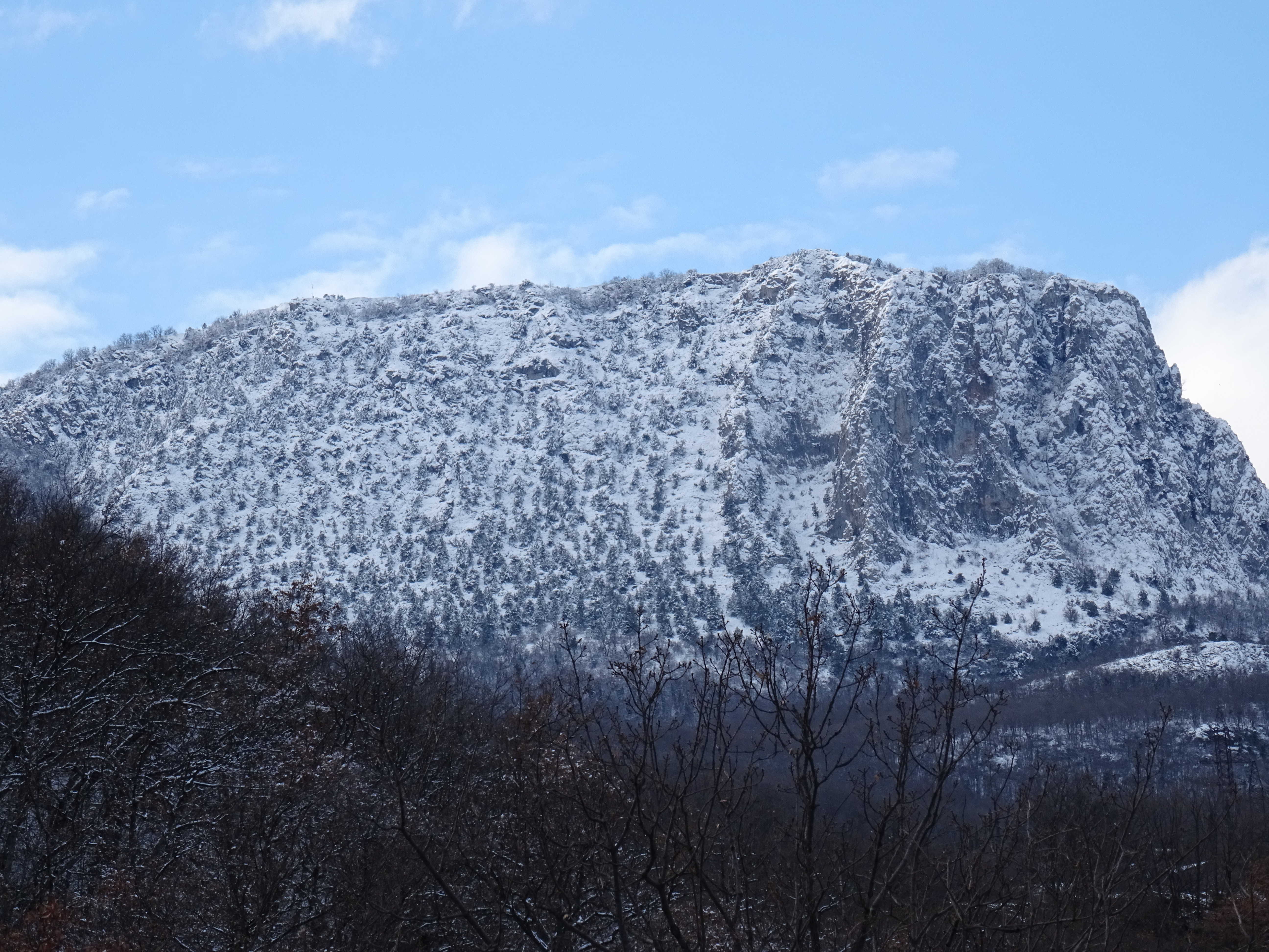 Если максимально увеличить фото Куш-Каи, то можно рассмотреть по самой кромке вершины образовался снежный карниз. Довольно редкое явление. Северный ветер сдувает с вершины снег, он постепенно налипает на скалы, образуя эдакий нависающий над пропастью карниз, который может достигать 3-4 метров. В молодости я подымался туда что бы покататься на лыжах, однажды дошел до самого края и понял, что земли подо мной нет. Снег выдержал. Адреналина было много