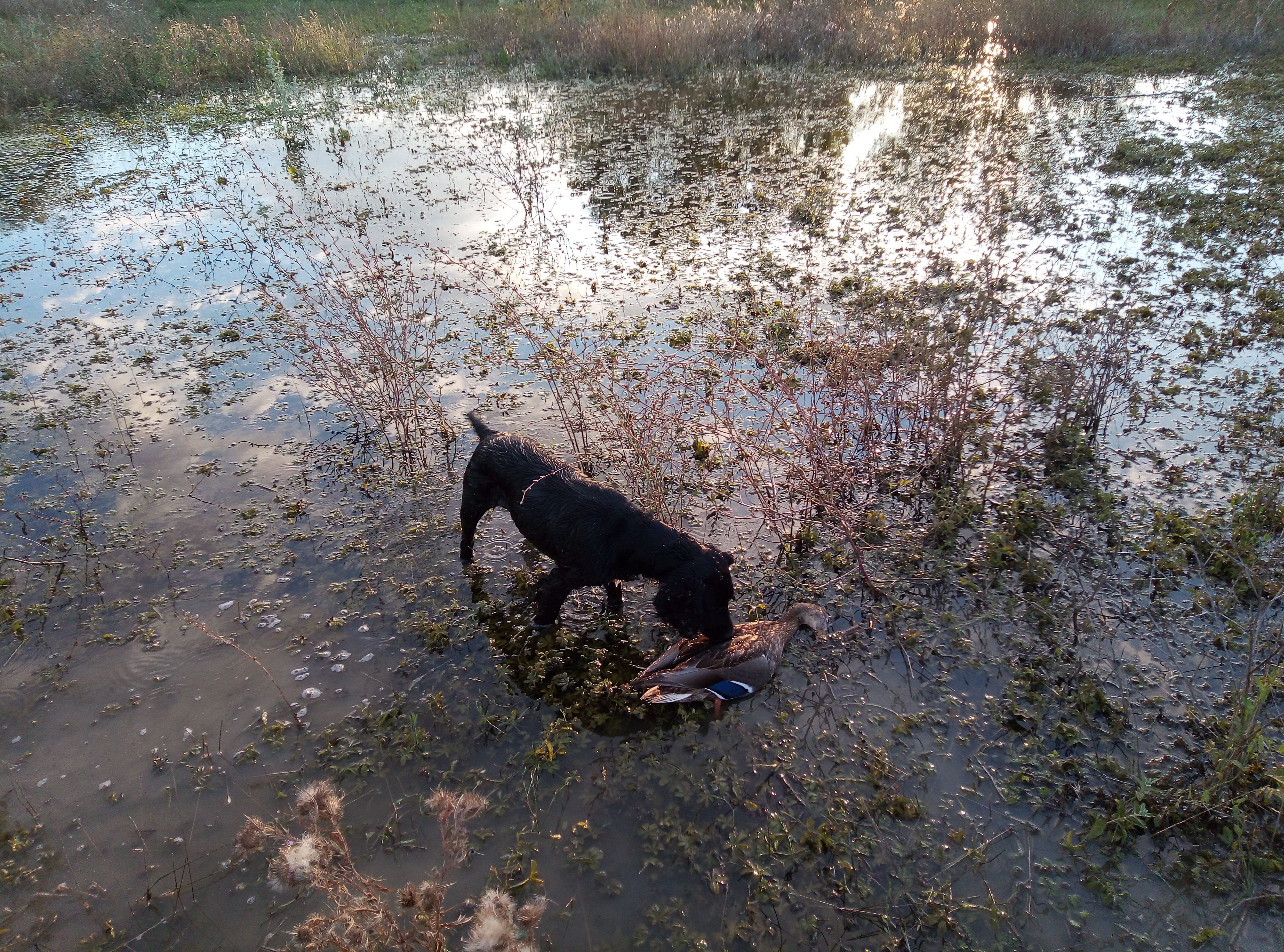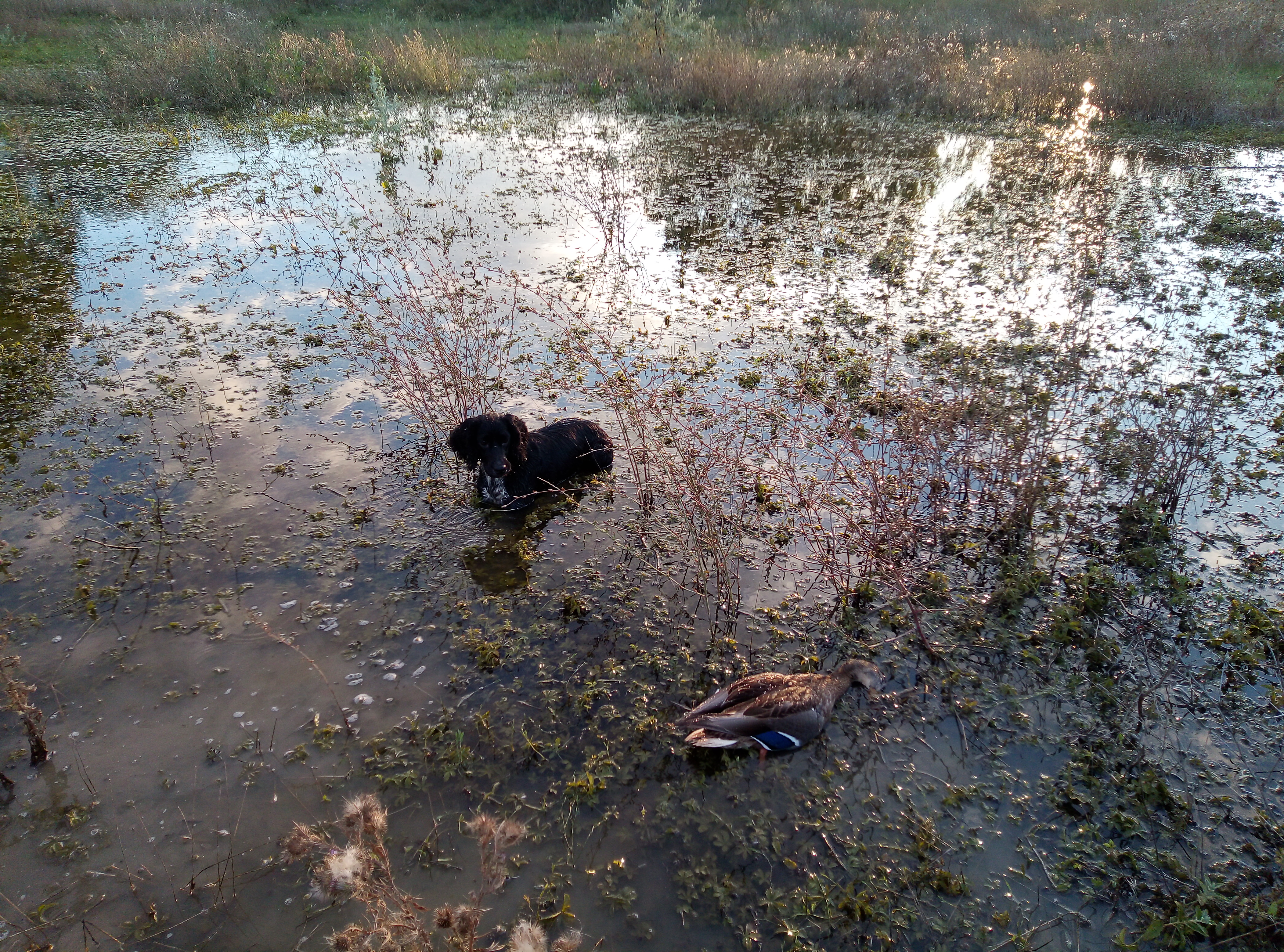 выбрались компанией из шести человек. С расвета пару часиков побрадили по угодьям, перепел присутствует, хотя не много, но собаке можно поработать. Нашли утиный выводок на "заповедном" ставочке, сбили три кряквы. После шурпа