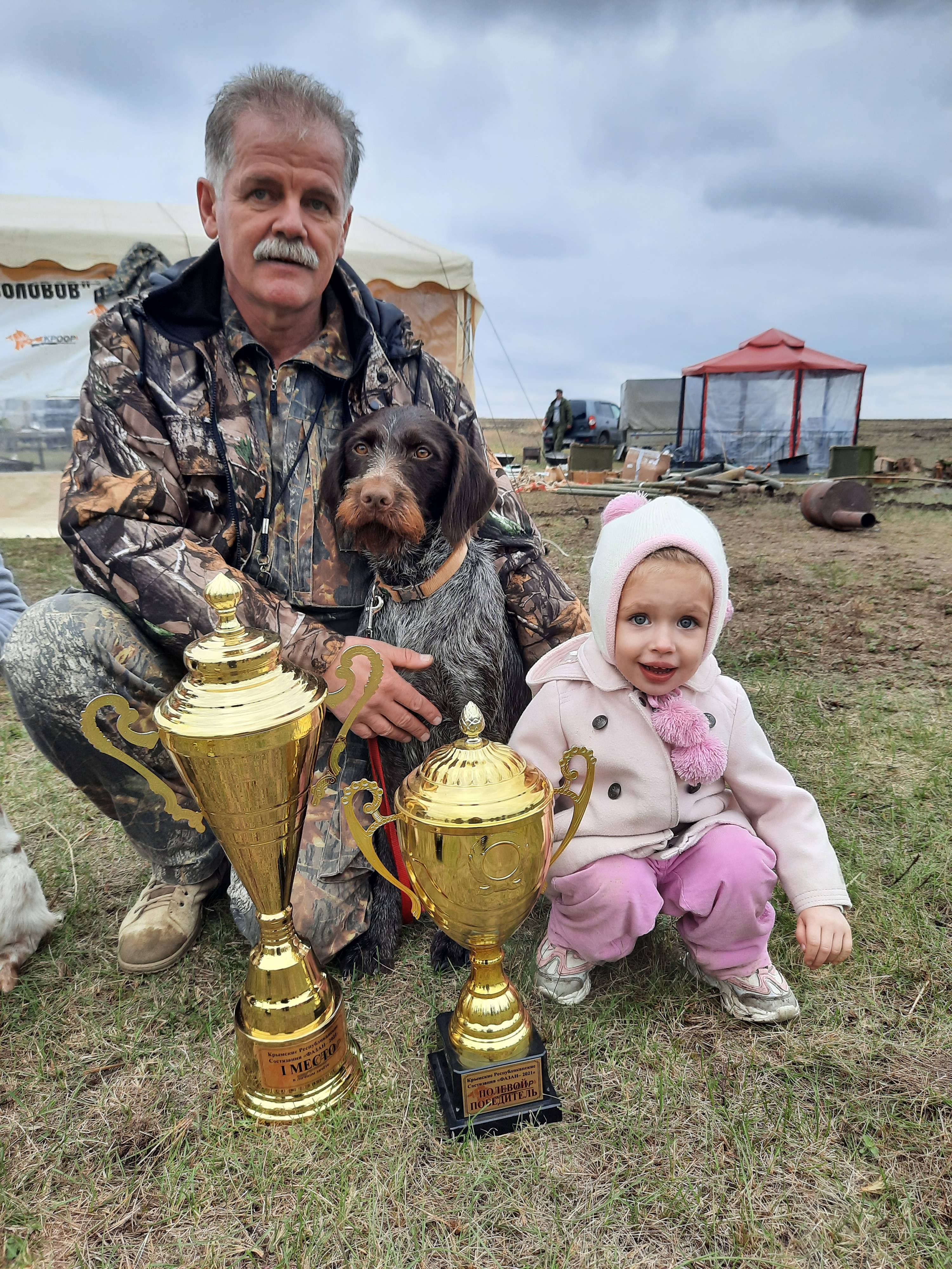Так получилось, что мне, как и в состязаниях по перепелу, снова довелось увидеть работу всех трех призеров состязаний, выступавших в разных комиссиях, коротко расскажу об их выступлениях. На тот раз диплом I степени и звание "Чемпион состязаний " не присуждались.. Победителем состязаний с дипломом II степени при 83 баллах и полными "пятерками за стиль стала дратхаар Лина Телеша. Успех ее не случаен, в 2019 году на Крымских состязаниях по фазану Лина, будучи совсем юной, стала третьим призером. Я знаю, что этому выступлению собаки на состязаниях предшествовала ее серьезная подготовка со стороны хозяина, плоды его трудов налицо. Сначала Лина четко и красиво отработала табун куропаток. После чего, ведущий не отвел собаку подальше в сторону, а тут же снова пустил ее в поиск. Она, конечно же, сразу отметила "теплое место" твердой стойкой. Хозяин, вместо того чтобы отозвать собаку, наоборот, послал на подачу. Пусто! Это была единственная ошибка Лины, конечно же по вине хозяина, две ее последующие работы по фазанам были безукоризненными. Последняя ее работа была в непосредственной близости от машин и участников состязаний, ожидавших своей очереди у дороги за деревьями. По посылу она подняла курицу, оказавшуюся почти под ногами у В.И. Поддубного.