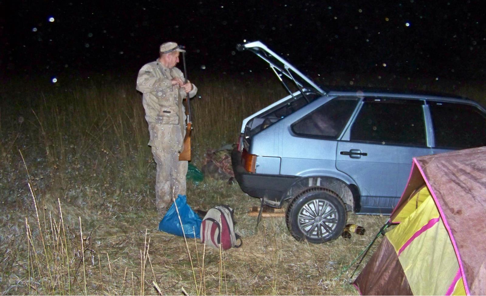 Пока выбирали место, оборудовали бивуак, наступила ночь. А виновника торжества и лоцмана (в одном лице), нет. "Сидю в кукурузе сидю и сидю, уж мисяць на нэби а я все сидю" скучна однако. Вот когда начинаешь понимать, как трудно было Петровичу, ждать нас в гараже. один на один с пивом... (граф не в счет он в завязке.)
