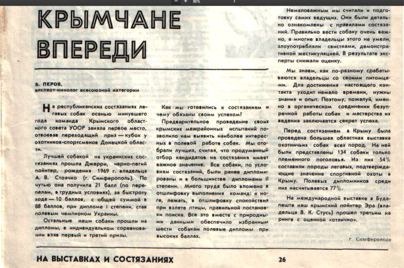 Данная тема о пойнтерах ,если помните , начиналась с публикации статьи эксперта Всесоюзной категории А В Стоячко, самого известного и компетентного безусловно Крымского(и не только в таком масштабе) пойнтериста, человека ,сделавшего в свое время для породы ( и , соответственно, для нас- любителей охоты с пойнтером в частности и с легавыми вообще) колоссально много - и заканчивалась следующими словами :