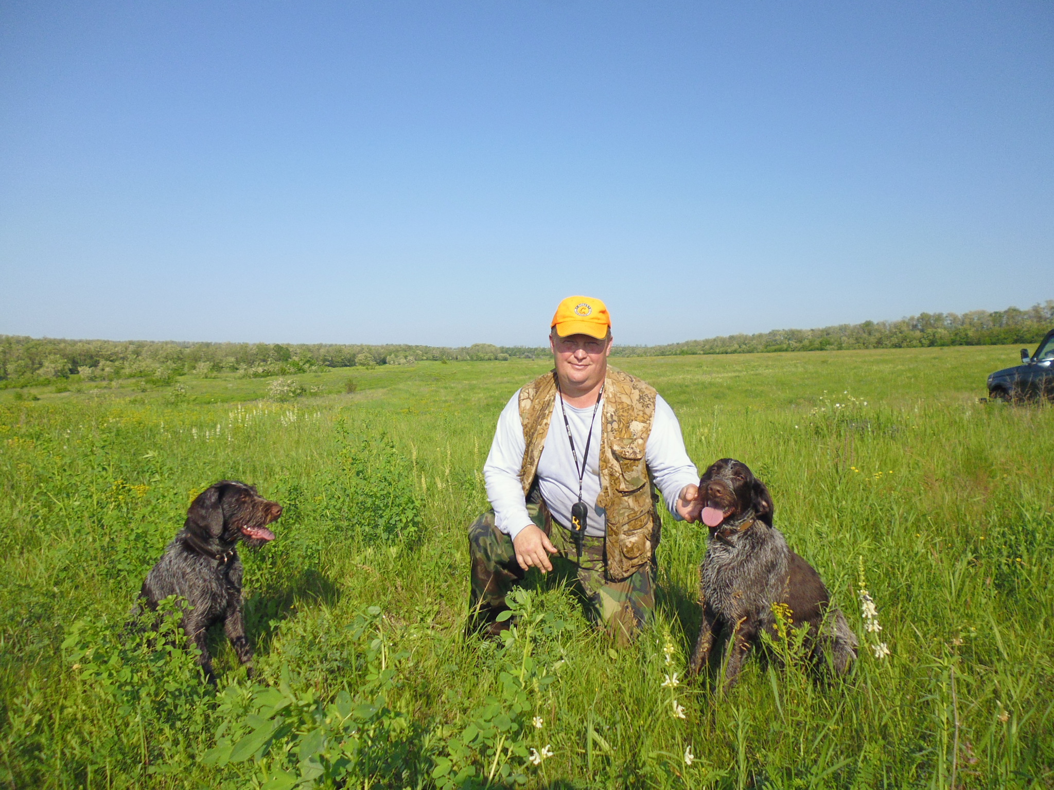 19 августа мы выехали в поле на открытие охотничьего сезона-2016 г. Готовили шулюм из добытых в 15 г. перепелов и утки, соответственно хорошо посидели и "отдохнули". Это была первая охота моих дратхааров и мне было интересно посмотреть на результат моих тренировок. Поле было хорошее, рядом рос подсолнух, но перепела было мало, т.к. давно не было дождей и было сухо и безветренно. И если бы не охотники, которые приехали под утро и поставили манок, то наверное было бы еще меньше. Собаки работали хорошо, пока не стало жарко и в итоге мы добыли 6 шт, все трудовые, промазали столько же. Собаки работали со стойкой, шумовых старались не стрелять, Умбра принесла двоих- не съела, и не жевала, я доволен...