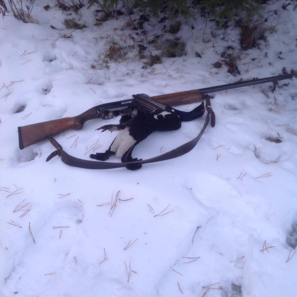 Вот ещё один петушок. Очень неудобно стрелял. Да и на пределе. Петухи подсели на вершину высокой берёзы. После выстрела тот, по кому стрелял, слетел, но я был уверен что попал, т.к. полёт был ну ... не знаю... Не такой, в общем. Правда в воздухе я его видел три-четыре секунды, когда слетев, он пролетал над поляной. Пошёл в сторону куда скрылся петух. Иду, смотрю по сторонам - нет! Уже далеко ушёл от места стрела. Думаю, нужно возвращаться, наверное показалось, что зацепил! Решил дойти до пушистой сосёнки, стоящей шагах в сорока впереди. Подхожу, и ... прямо под ней лежит мой тетерев! Лира поднята, и развёрнута, крылья чуть отставлены в стороны и приоткрыты. В общем почти токовая поза, только голова на снегу... Обратно замерил расстояние на которое улетел петух - 430 больших шагов! Очень рад что понапрасну не загубил пичугу.