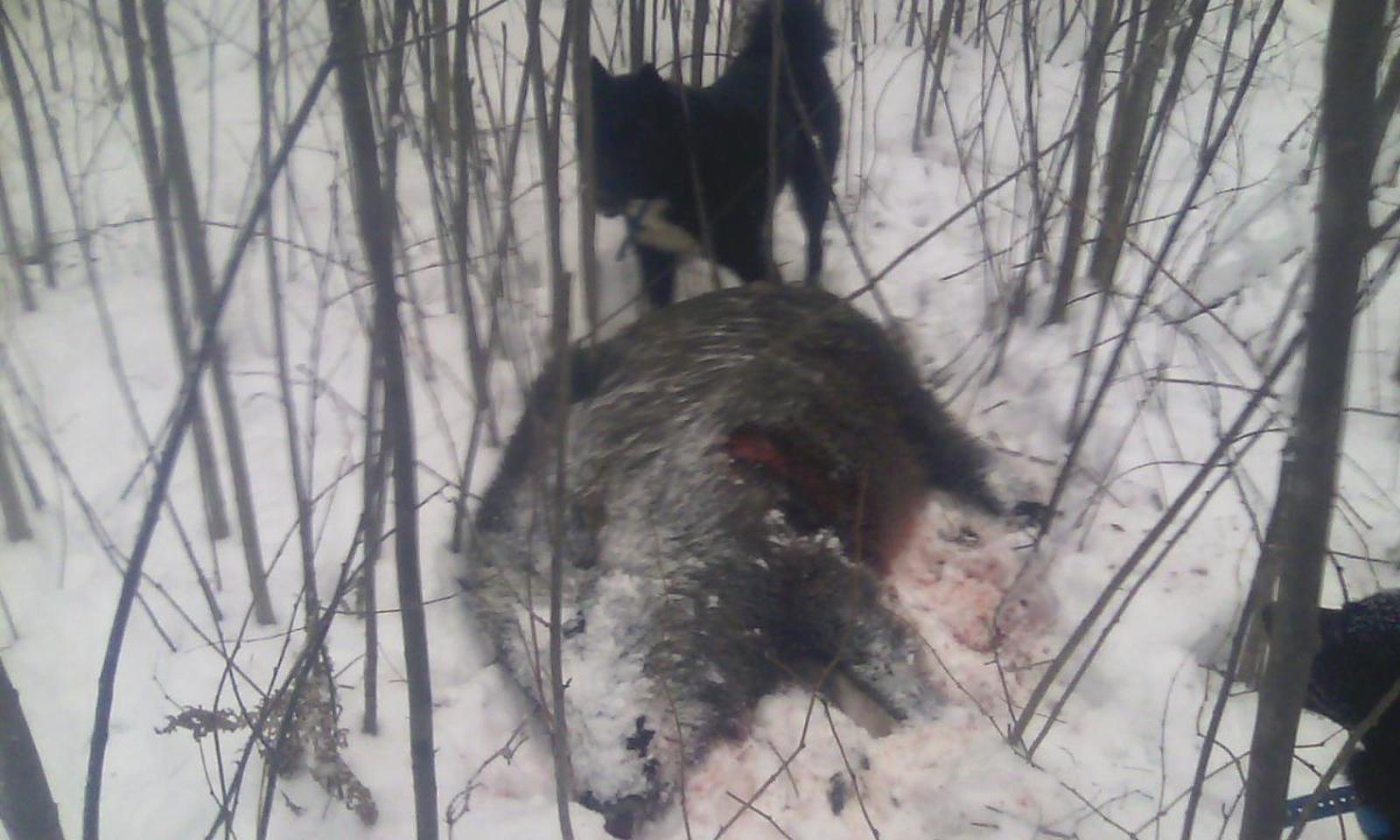 Четверг, раннее утро, Вадим как договаривались заезжает за мной, грузим вещи, собак, поехали. Выезд в этот раз предстоял в соседнюю область, куда нас пригласили погонять скотинку! Приехав на место как всегда первыми, решили пока ждем сделать объезд. Несмотря на обильный ночной снегопад следы имелись, но только одиночные, кабаньи. Нам же предстояла охота и на кабана и на лося! Примерно прикинув где зверь встал мы решили сократить путь и выехали на поле где успешно застряли в огромной луже припорошенной снегом. Все наши усилия и срубленные лаги успеха не дали а сделали только хуже(( Решили ждать помощь которая уже спешила к нам. Приехавший патрол выдернул нас без особых усилий, но что то настроение подпортилось... Ну да ладно, надо расставляться, егеря повезли бригаду на номера а мы с Вадимом поехали к заходному следу кабана, от куда и было решено начинать загон. Команда по рации и собаки полетели по следу, мы же разделились и тоже пошли в сторону номеров. Смотрю по навигатору а собаки бегают как угорелые на одном участке но лая не слышу, потом стали смещаться дальше, подойдя туда понял что произошло, в этом месте все было изрыто и исхожено что и смутило собак но разобравшись они пошли дальше по следу. Пройдя еще немного послышался лай, все, нашли, бегу на лай и смотрю на навигатор, идет смещение на номера, хорошо! Иду дальше, собаки подходят к номерам, выстрел, второй.... собаки проскакивают номера и продолжают работать, бегу к номеру, что, как? Стрелял, промах, собаки гонят секача смотрю на навигатор 300м, забег продолжается))) Мчусь сломя голову на помощь собакам, как на зло лес просто не проходимый, не зря он сюда залез) но несмотря ни на что я приближаюсь! И вот я уже его вижу, здоров, вижу только задницу и горбину))) Вскидываюсь, стреляю... идет зараза... собаки работают плотно, лес густой, видимость ноль... Дыхалка кончается)) прибодрила кровь на снегу, заранил, рывок и выхожу на поляну с плотным мелятником, вижу куча мала, собаки его остановили окончательно, стрелять боюсь, собаки плотно на нем висят, да и кусты сплошняком! Резать что то тоже страшновато, не поросенок))) Выбрав момент, когда он повернулся боком стреляю, все лежит, подхожу, пытается встать, контрольный в голову)) и он замер! Умницы собачки, порадовала Рунька, взяли ее в этот сезон первый раз после щенков и не подвела!!! Ну и конечно два братана Рэм и Рой сладкая парочка)))