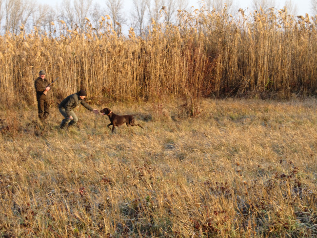 Из трех встреченных птиц одна отстреливается из-под стойки собаки с проверкой подачи.