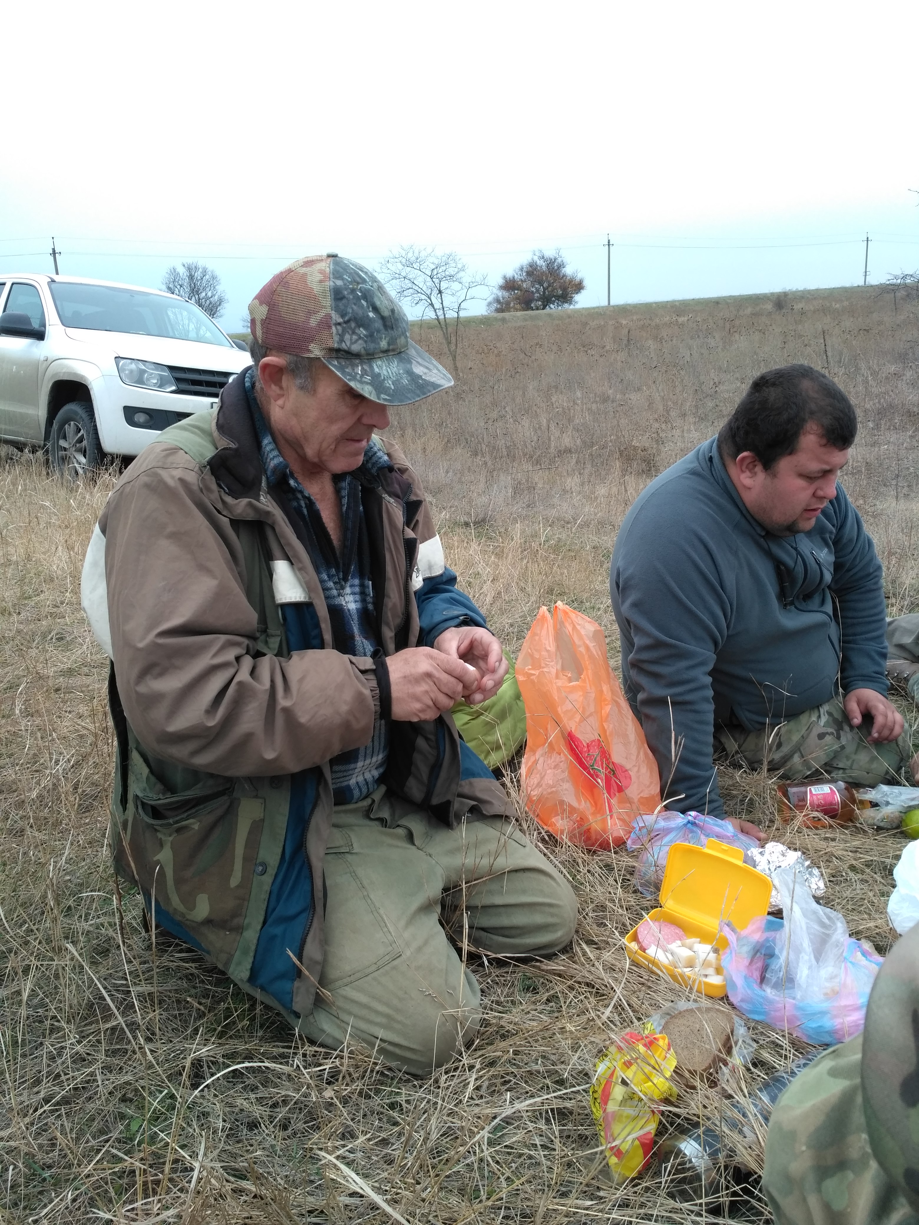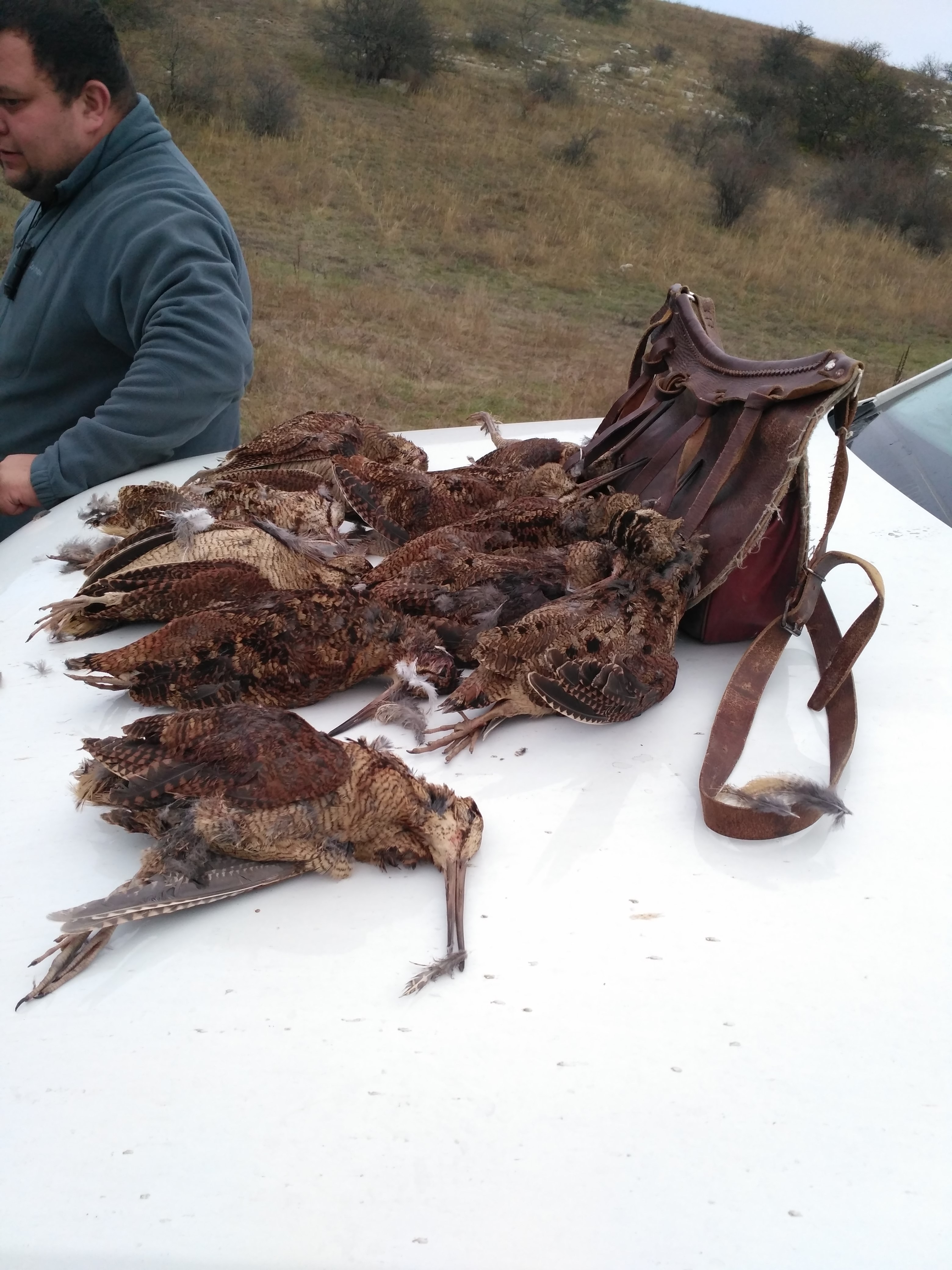 В пятницу позвонил Леонид Иванович и сказал вальдшнеп сыпанул. Едете? Конечно едем. В авральном порядке проплачиваем разрешения и в 6 утра субботы стартуем. Охотиться предстояло в шестеро. Поэтому по приезду на место расходимся каждый в своём направлении. У ребят переодивается гремят выстрелы, а у нас пока тишина. Или нам не повезло с местом, или делаем что-то не правильно. Но собаки даже не переходят на потяжки. Отработали два табунка куропаток, а вальдшнепа почему нет. Сходимся. У ребят 3 добытых вальдшнепа. Обсудили ситуацию. Переезжаем на новое место. Место не позволяет ходить 3 группами. Ходим 2. В заброшенном винограднике попадаются 2 перепела, несколько табунков куропаток. Вальдшнепа не много но все-таки есть. Видимо этой ночью большая часть его уже отлетела. Обедает. И снова на поиски. Переодически попадаются охотники. Корректируем сними свой маршрут,чтобы не тратить время на хоженные места. Много грибников. Четверка дроф поднимает настроение. Помогали им кепкой. И дальше на поиски. День пролетает незаметно. И в зачёт жизни вероятно не пойдет.