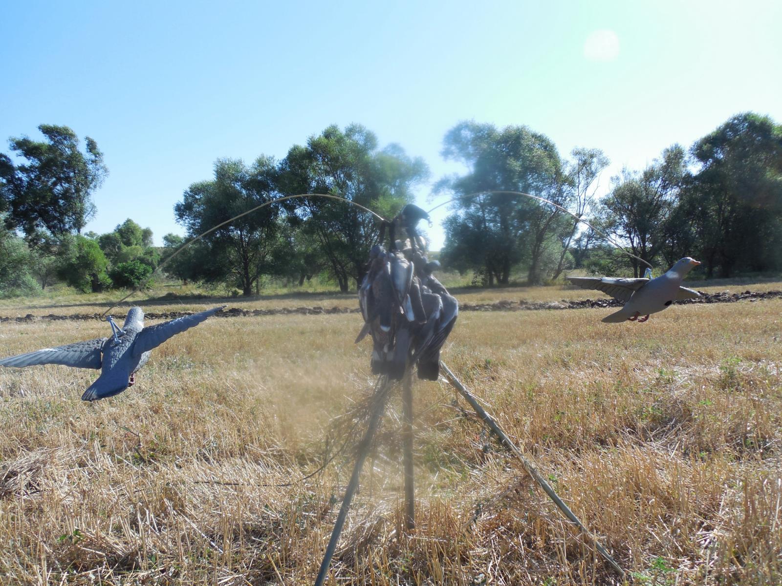 Охотились (сидя в тенечке) 8 и 9-го с рассвета до 9 утра. Место охоты было выбрано после объезда 2-х обходов на стерне, т.к. подсолнух еще не вызрел. 8-го лет был приличный, но стрельба-не очень,-как и внимательность: 4 горлицы, 3 вяхиря. 9-го, напротив, перелета практически не было(безветрие), но в результате - 4 вяхиря и 5 горлиц. Более чем удовлетворен.
