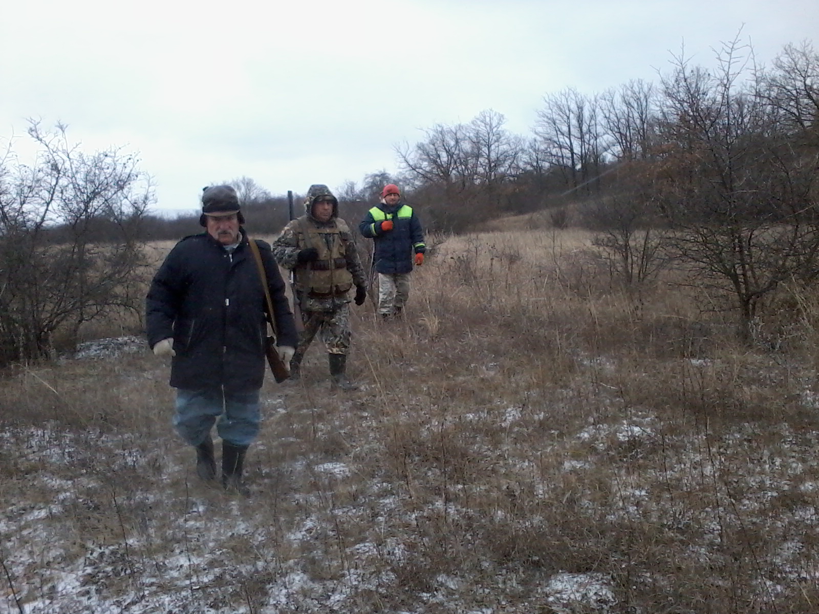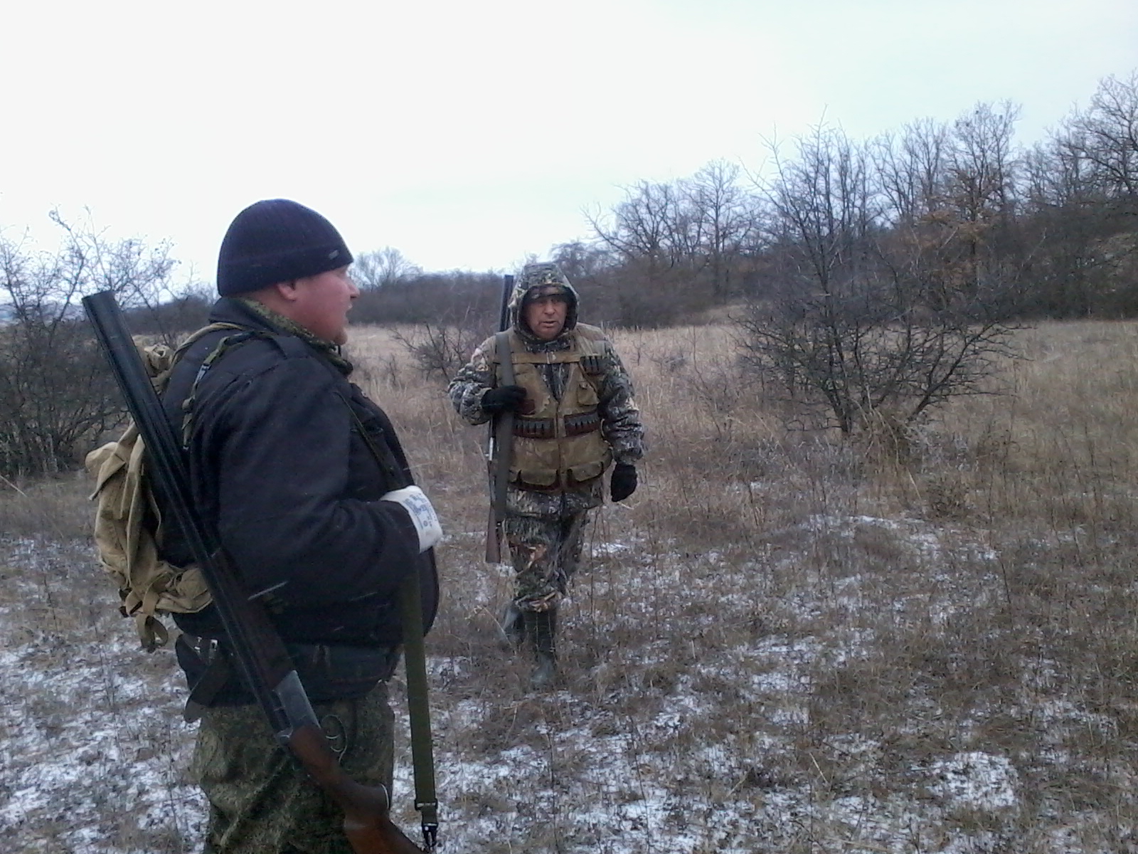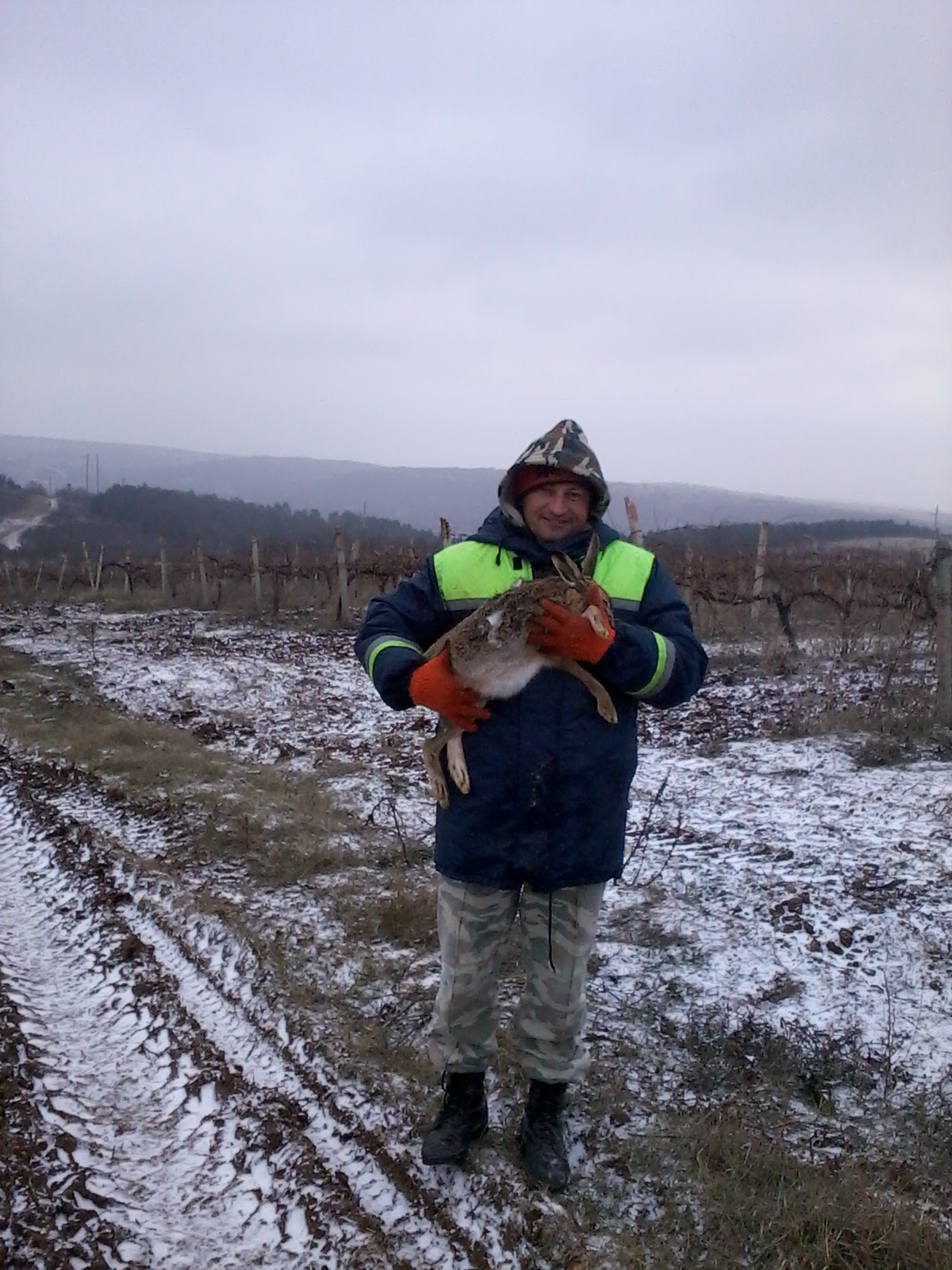 ветер дул будь здоров.Ходили компанией из семи человек,плюс две собачки.Итог семь подняли ,четыре взяли.Заяц лежал на косогорах,под леском.Последнего взяли в паханом через ряд винограднике,зашли на "разведку"