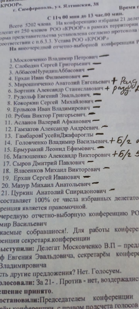 Пусть руководители районных филиалов обратятся в территориальные органы ФСБ. Может быть у этой кучки псевдо-делегатов так называемой "конференции" совсем другая цель? Судя по её "делегатам "(и видео где "благодарные жители феодосии благодарят своего благодетеля", и ещё некой организации КРЫМСКАЯ РЕСПУБЛИКАНСКАЯ ОБЩЕСТВЕННАЯ ОРГАНИЗАЦИЯ ПО ПРОТИВОДЕЙСТВИЮ КОРРУПЦИИ "НАРОДНЫЙ КОНТРОЛЬ" кто в её составе, и кто из этой организации был "выдвинут" (непонятно кем) так называемым "делегатом конференции" а потом "избран" в "правление". Да, и обратите внимание кто является замом у Рудольф Е.Э. ("заместителя правления"). Нужно придать этому беспределу максимальную огласку, правда она ОДНА и я думаю все кто принимал участие в этой афере - УЖЕ ОЧЕНЬ СОЖАЛЕЮТ(кроме "нового председателя" судя по определению суда за №33а-4869\2020), и не один здравомыслящий чиновник не захочет прикрывать эти махинации!