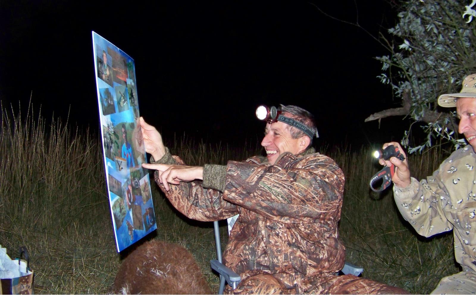 Три товарища, Сергей, его брат Дмитрий и водитель Владимир обменявшись с нами приветствиями, (на чем собственно и закончилась официальная часть). быстренько соорудив спальню и разгрузив машину присели к столу на дружеский банкет, накрытый в честь знаменательной даты, где был провозглашон не один тост за...!!!!!! После чего, виновнику торжества, был вручен скромный подарок, который, как Сказал Сергей, займет особое место в его фото галерее.