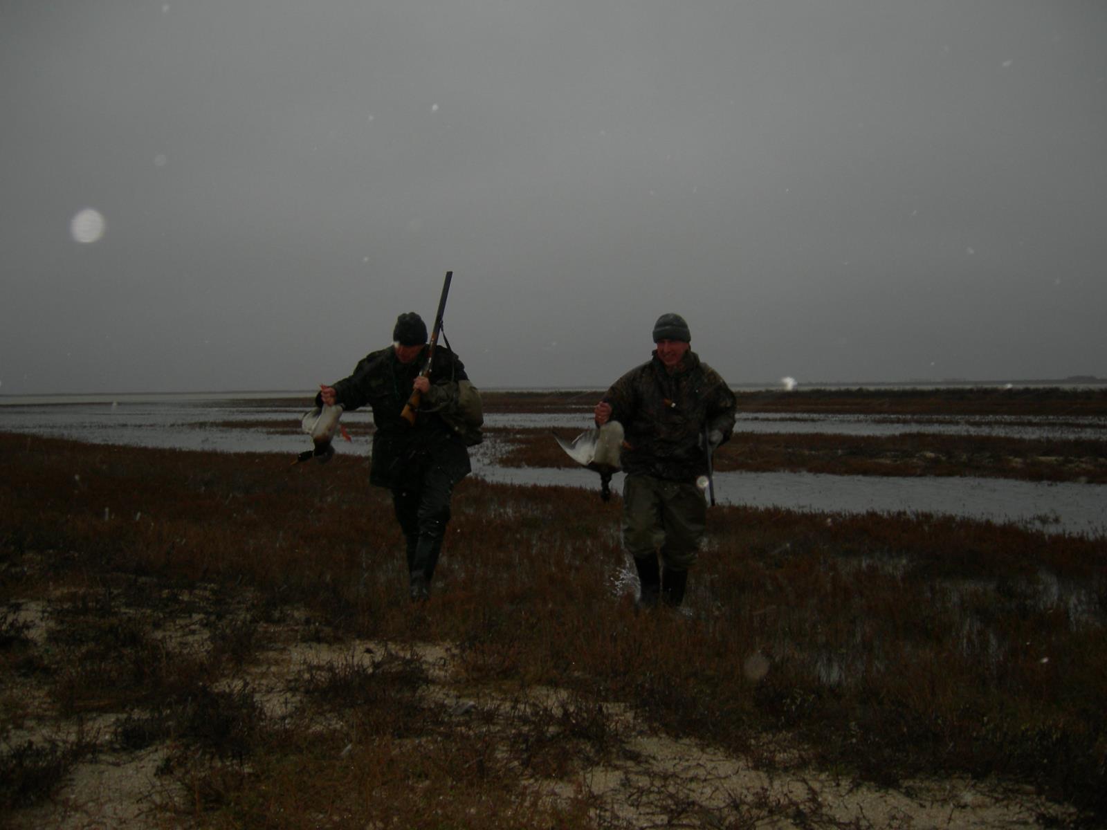 Через некоторое время опять налетает стайка, я в темноте просто еще их не вижу, гремят выстрелы и уже оба брата бегут за утками.