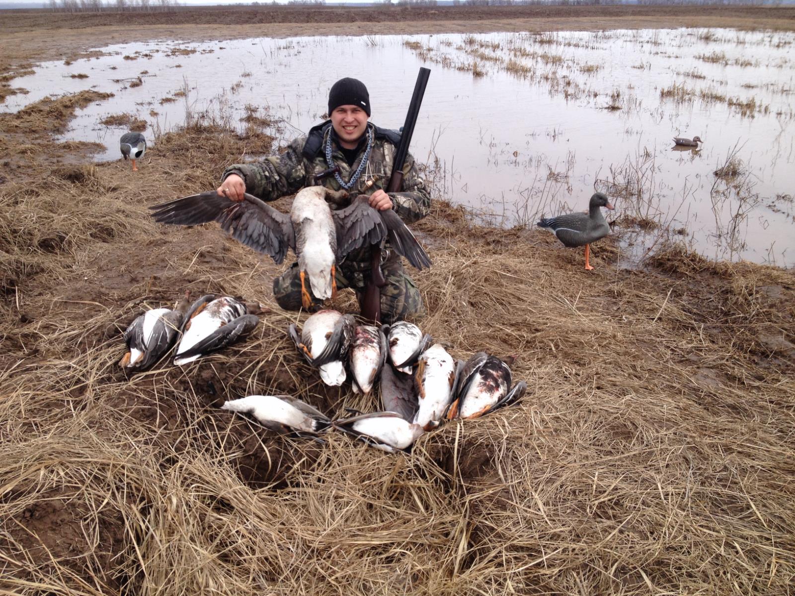 Селюшок один налетел, но далековато, пары крутились на выстреле - я не стрелял. К утке никто не снижался особенно из селюхов. Пар много летало, в какой то момент на них уж и внимания особо не обращал. Одна пара почти потемну привлекла мое внимание молчаливым полетом и большими размерами, епт - гуси!. В стволе пятерка, гуси близко - метров 30, думаю уроню, выцеливаю второго, стреляю - готов. Гусиных чучел полбагажника, а я добыл с утиным. Но как положено - с чучелом из укрытия. Вот такой грешок.