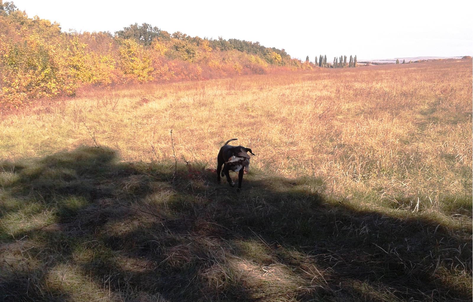 Нам ничего не оставалось, кроме охоты на ближайшем поле, где очень скоро Айна нашла 3 выводка куропатки и подняла зайца, который после выстрела "в угон" пытался уйти от нее на трех конечностях, но далеко, конечно, не ушел....