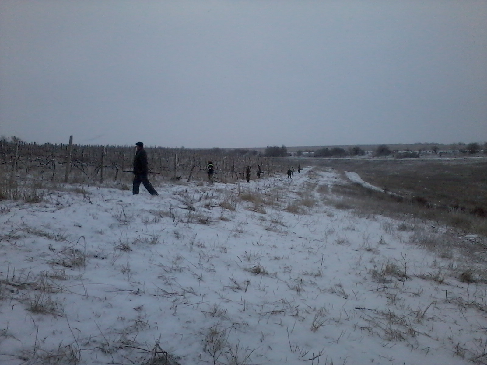 В воскресенье выбрались компанией из восьми человек и плюс три собаки.Шел снег,ветер сильный северо-западный с морозом.По этому решено было ходить по паханному винограднику и по балкам.Результат пятерых зайцев взяли,три поднялись за пределом выстрела,одного смазали.Из девяти поднятых восемь подняли в винограднике,одного на стерне в балке.В большинстве случаях заяц подымался далековато,но были и такие,что подымались с под ноги.Охоту закончили к 15.00 ч.