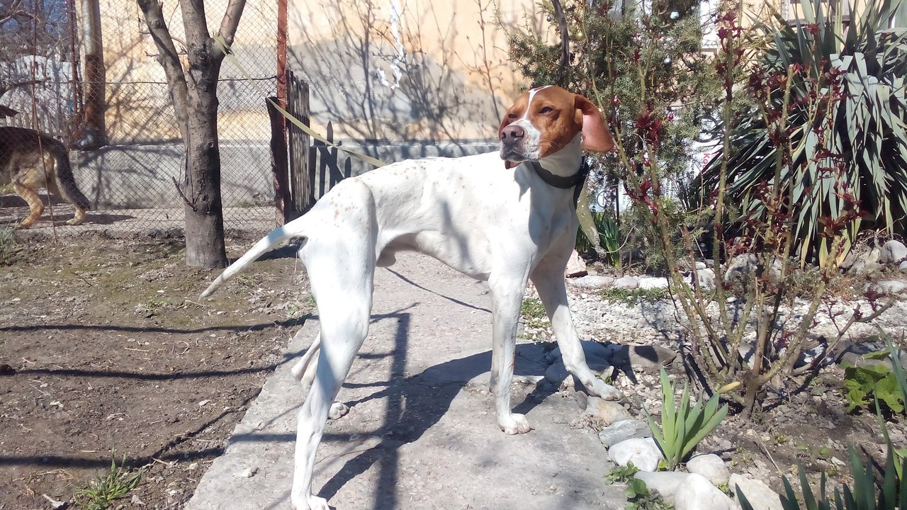 22 марта 2017г. В Бахчисарае в районе очистных найден молодой кобель английского пойнтера. Клеймо пока не смотрели. По словам ветеринара ему ещё нет даже года. (около 6-ти, 8-ми месяцев)