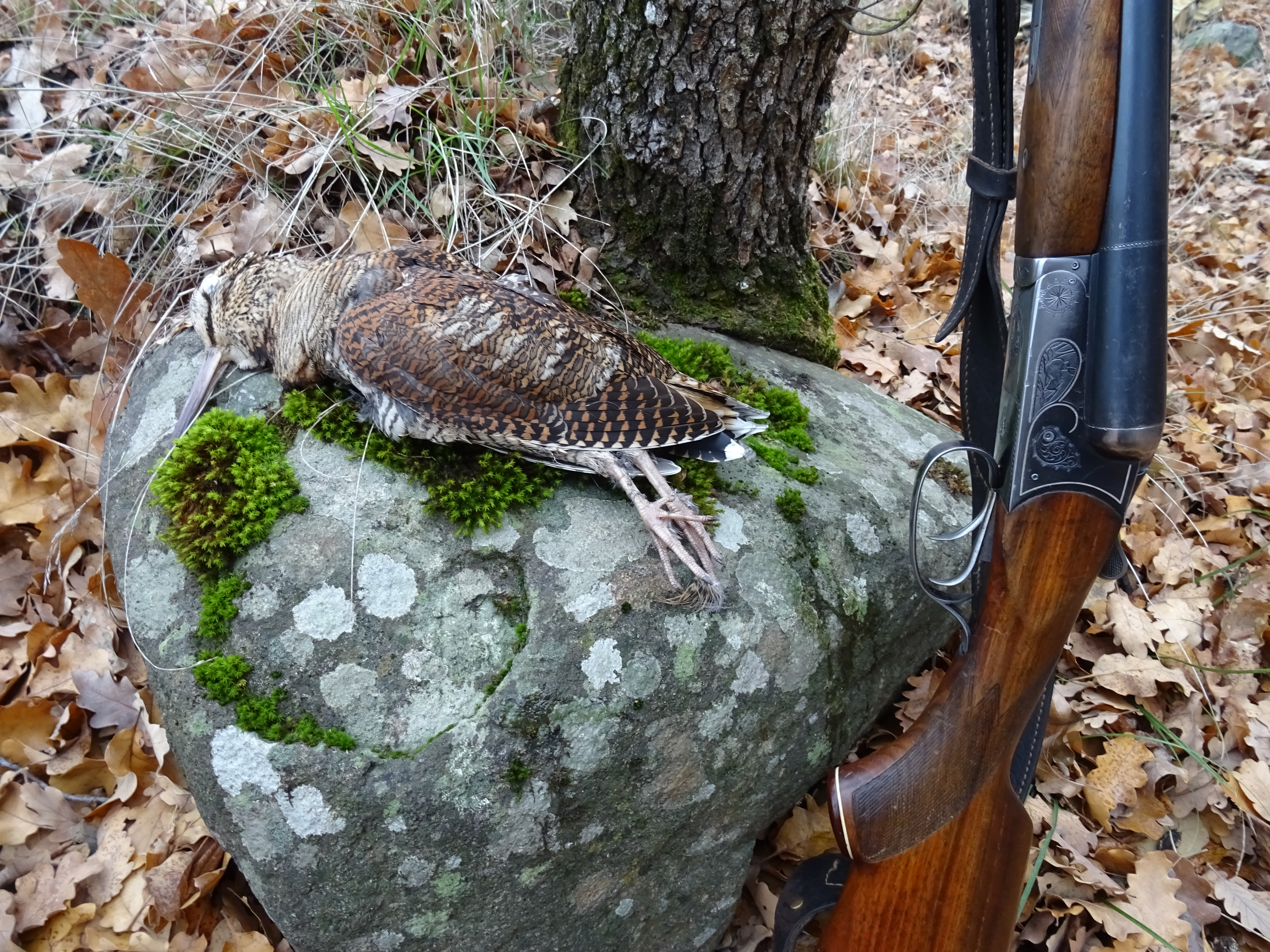 ружье на предохранителе и тут зайка поворачивает на 180 и бежит вверх, стреляю с левого( девятка Фетер), зайка катится вниз, от выстрела подымается шнеп и тоже падает, с правого спортивным. Дуплет!