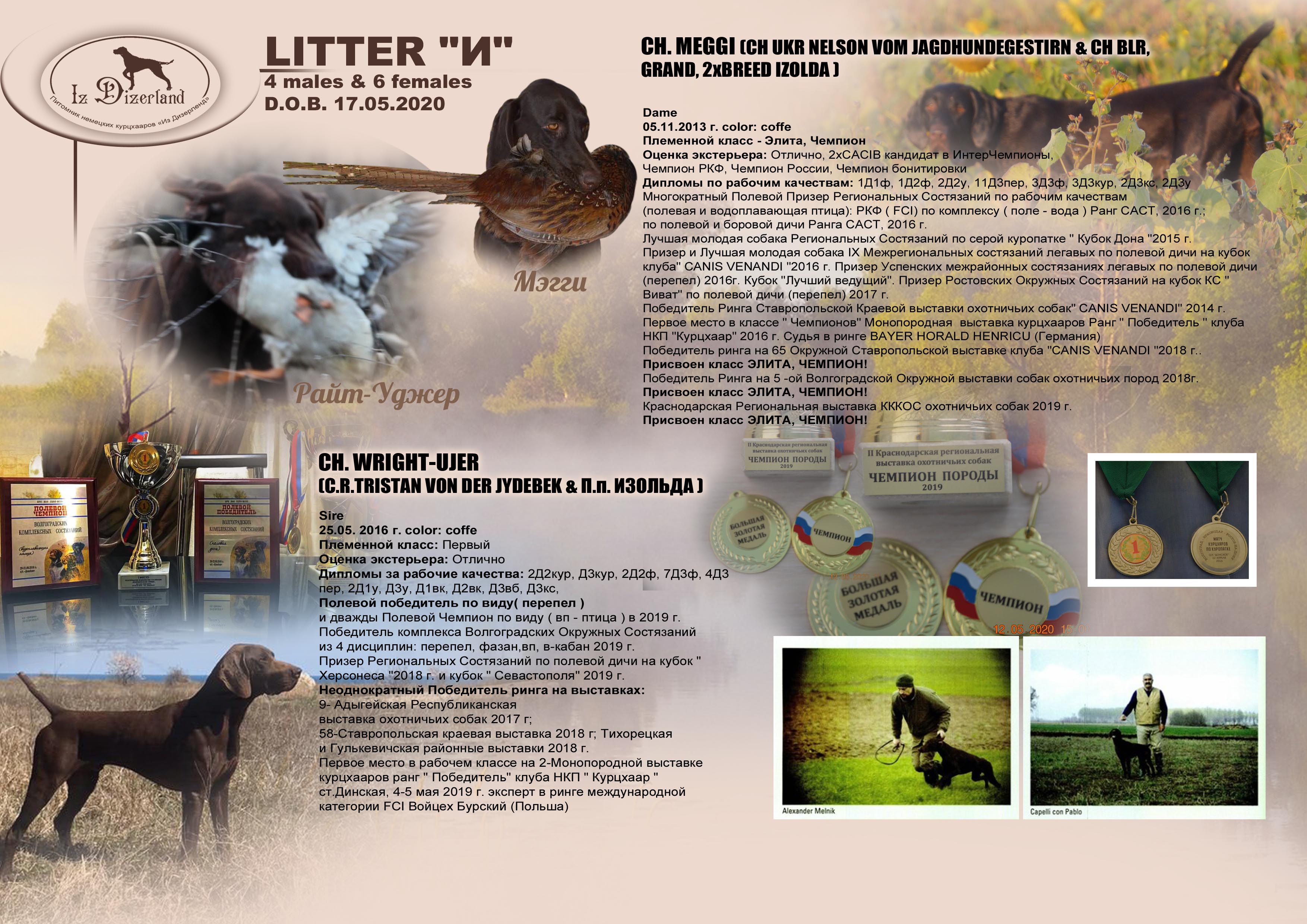 Первое место в рабочем классе на 2-Монопородной выставке курцхааров ранг " Победитель" клуба НКП " Курцхаар "ст.Динская, 4-5 мая 2019 г. эксперт в ринге международной категории FCI Войцех Бурский (Польша)