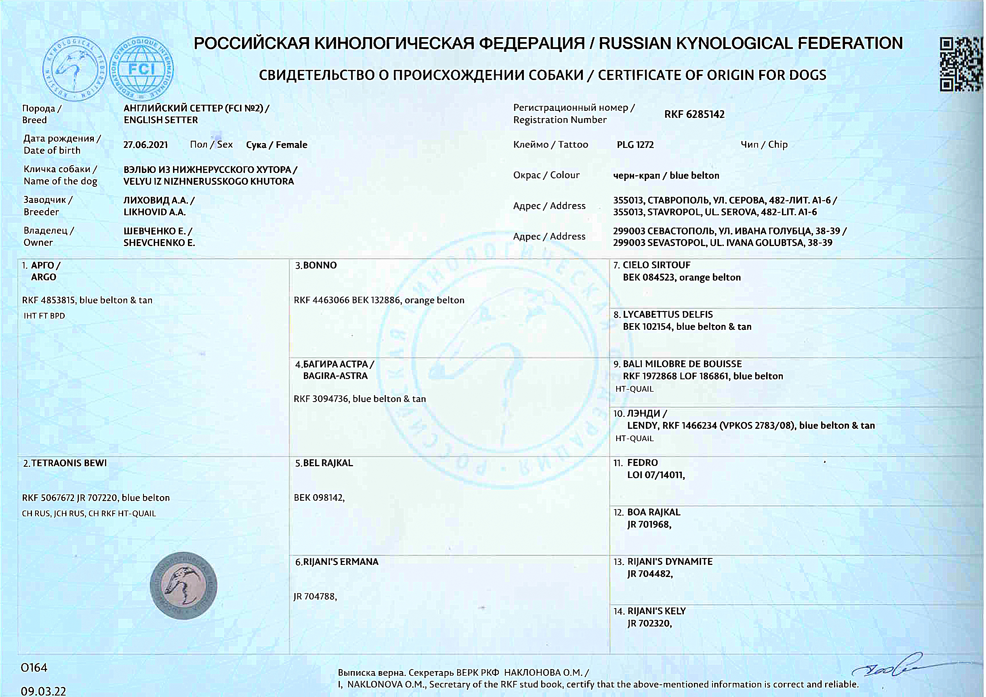 - Собака: Ирландский сеттер Осенний ветер Несси