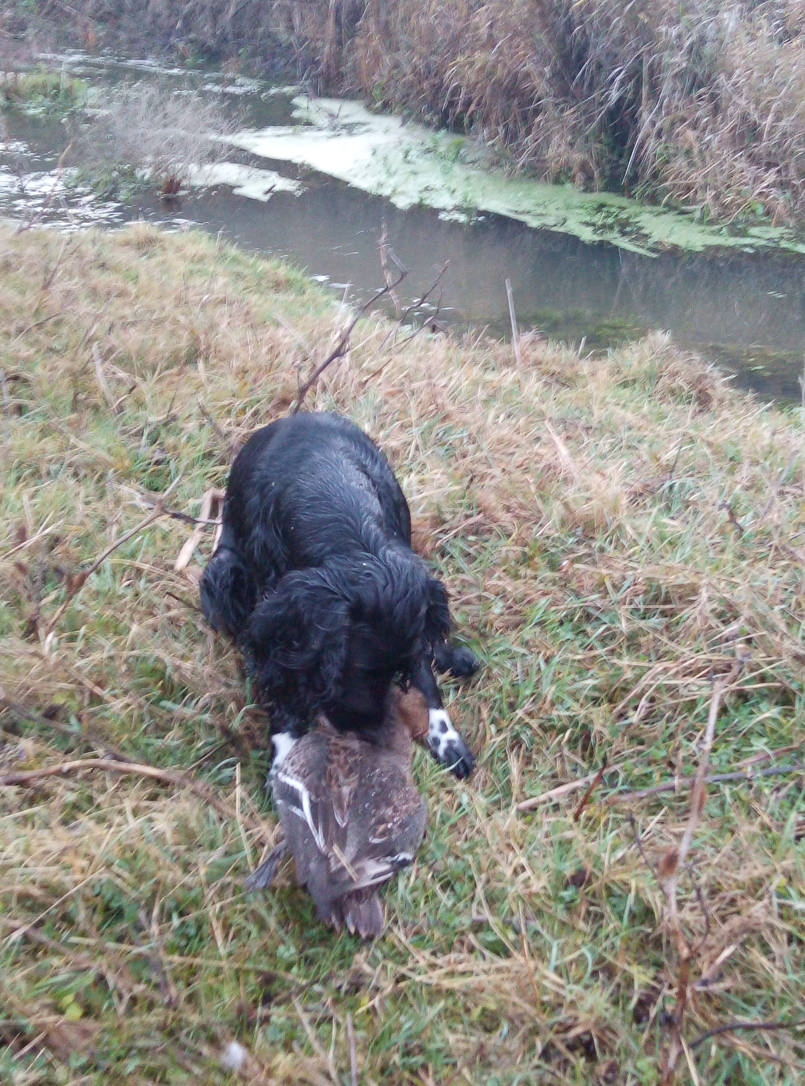 Очередная вылозка на утку с подхода, в прошедшую субботу. Под утро не большой заморозок с ветерком. С расвета по речке один подъем пары чирков трескунков, но ушли без выстрела. После проверяю ставочек рядом с речкой. По дамбе прошёл до середины ставка и с зади меня срывается пара кряквенной утки из камыша, дуплет и две утки падают. Одна на воду, вторая на берег. С воды помагет собачка