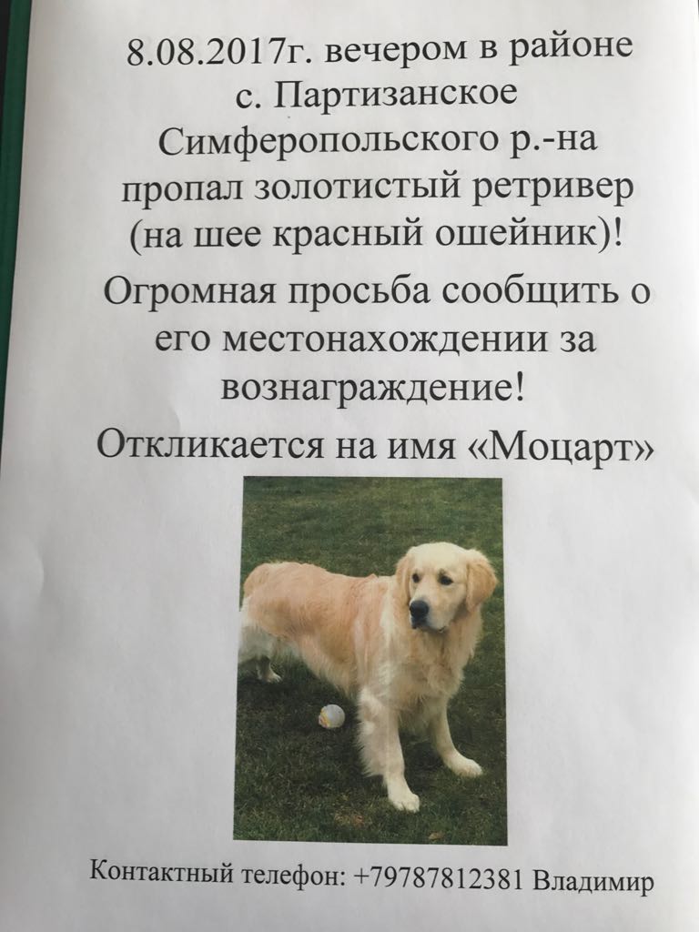 8.08.2017 в районе с. Патризанское пропал золотистый Ретривер, на шее красный ошейник, откликается на кличку Моцарт!